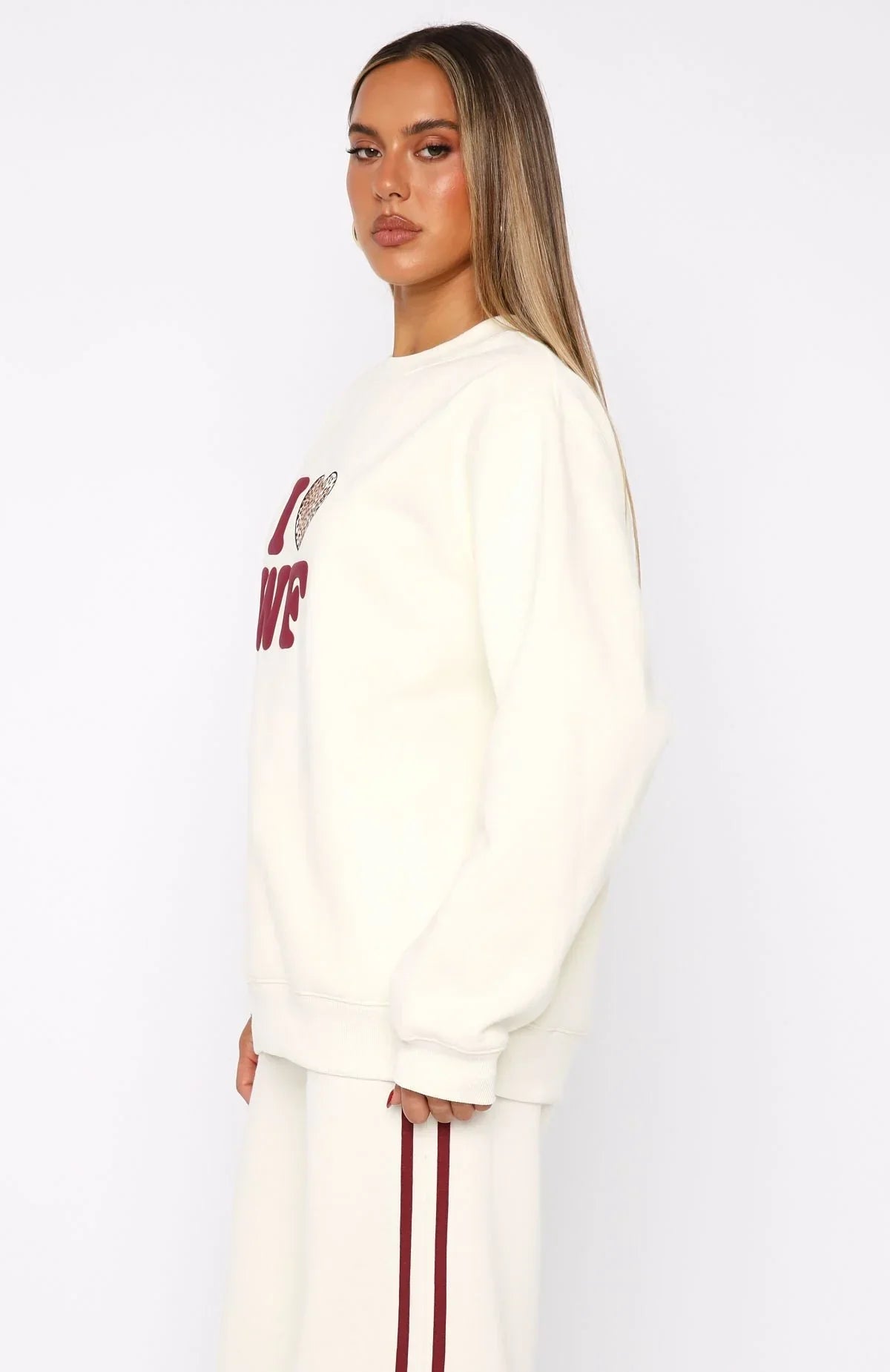 Listen to your heart and add the the 11th Street Concrete Jungle Oversized Sweater Cake Batter to your cart! Features a high scooped neckline, ribbed neckline, cuffs and hem, logo detailing centre front and super soft fleece lining for extra comfort. For the full vibe, pair with lounge shorts and cosy snug boots!