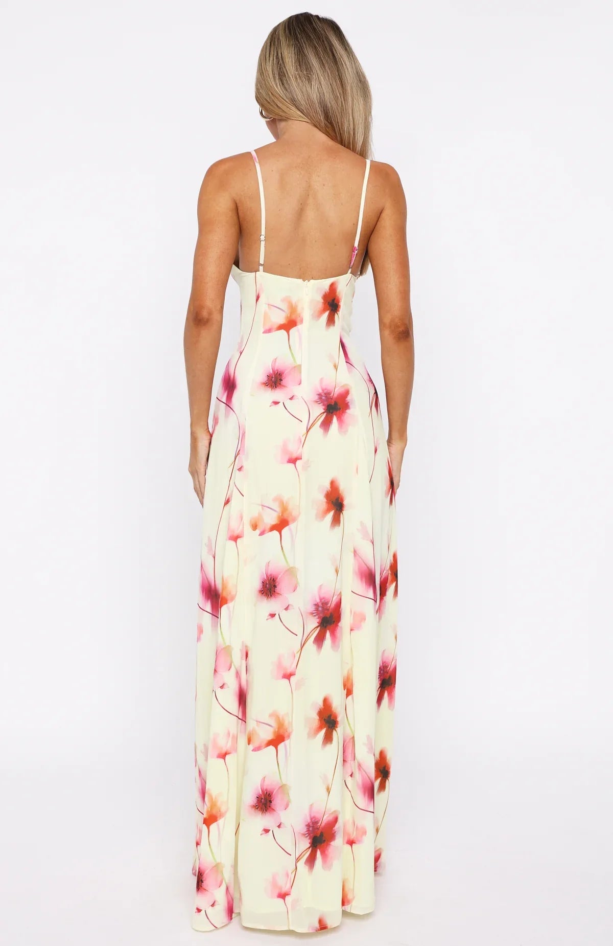 Make a lasting impression in the A Day In Nice Maxi Dress in Butter Floral. Features thin, adjustable straps and a sculpted bust with built-in cups for a flattering shape. The fitted waist then flows into a full-length skirt that sways with your every step. Style it with kitten heels, a chic shoulder bag and gold jewellery for a look that radiates sophistication wherever you go.