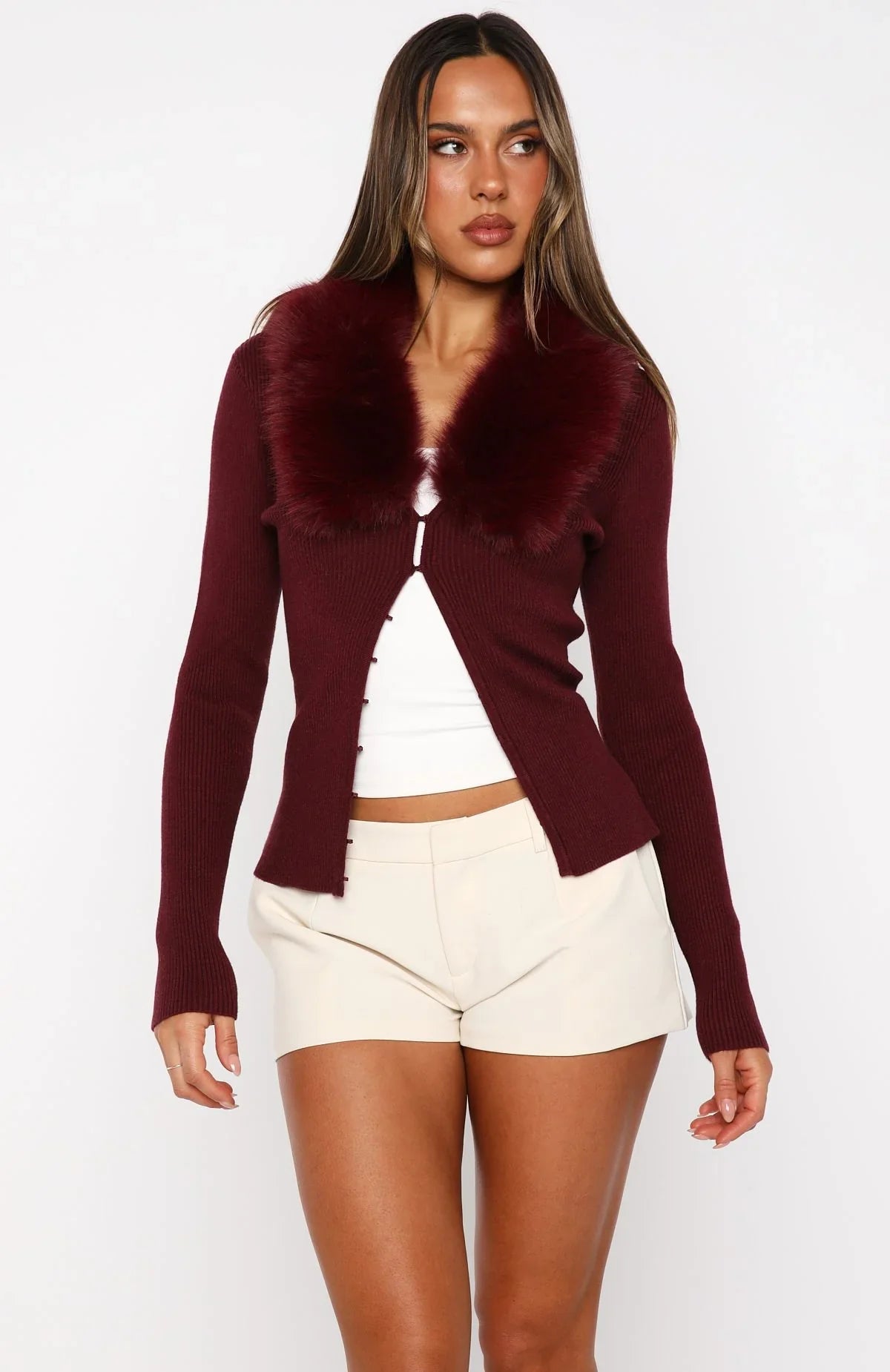 In Focus: Knitwear. The All Bundled Up Knit Cardigan in Burgundy is crafted from unlined high‑stretch knit fabrication, featuring a V‑neckline with a detachable fur collar, full button‑front closure, long sleeves and a relaxed silhouette. Style fashion pants with boots for a chic, city-night fit.