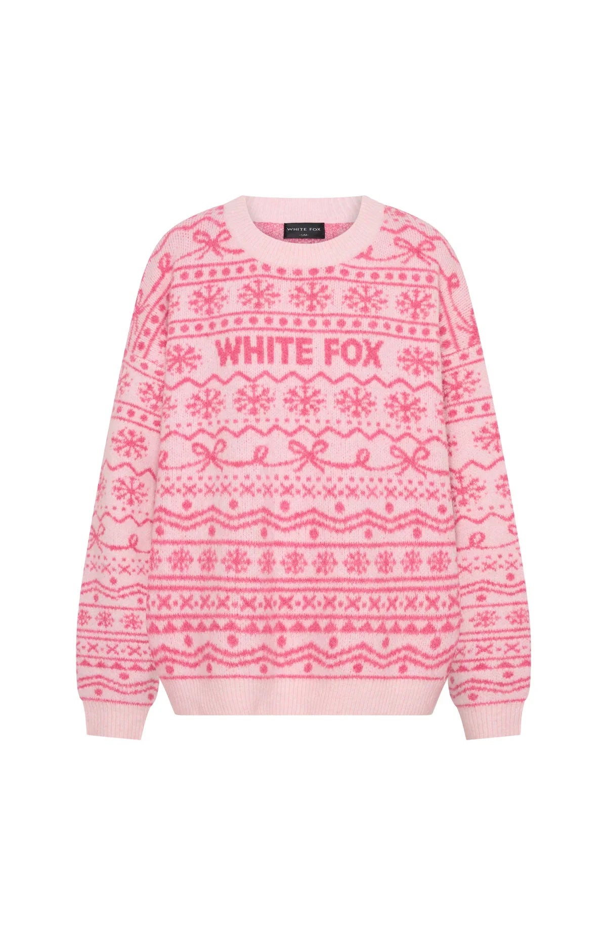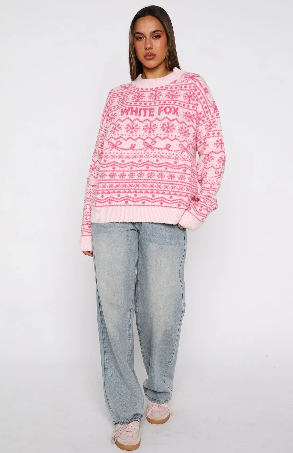 Cosy meets cute under the mistletoe. The Arctic Fire Knit Sweater in Baby Pink is designed with slouched shoulders and ribbed hems, which round out an oversized silhouette. Featuring long sleeves and an unlined knit fabric. Finished off with White Fox text centre front and back, paired with a Christmas-inspired design. Style with your go-to denim jeans, slippers and layered gold jewellery for a cosy Christmas Day look!