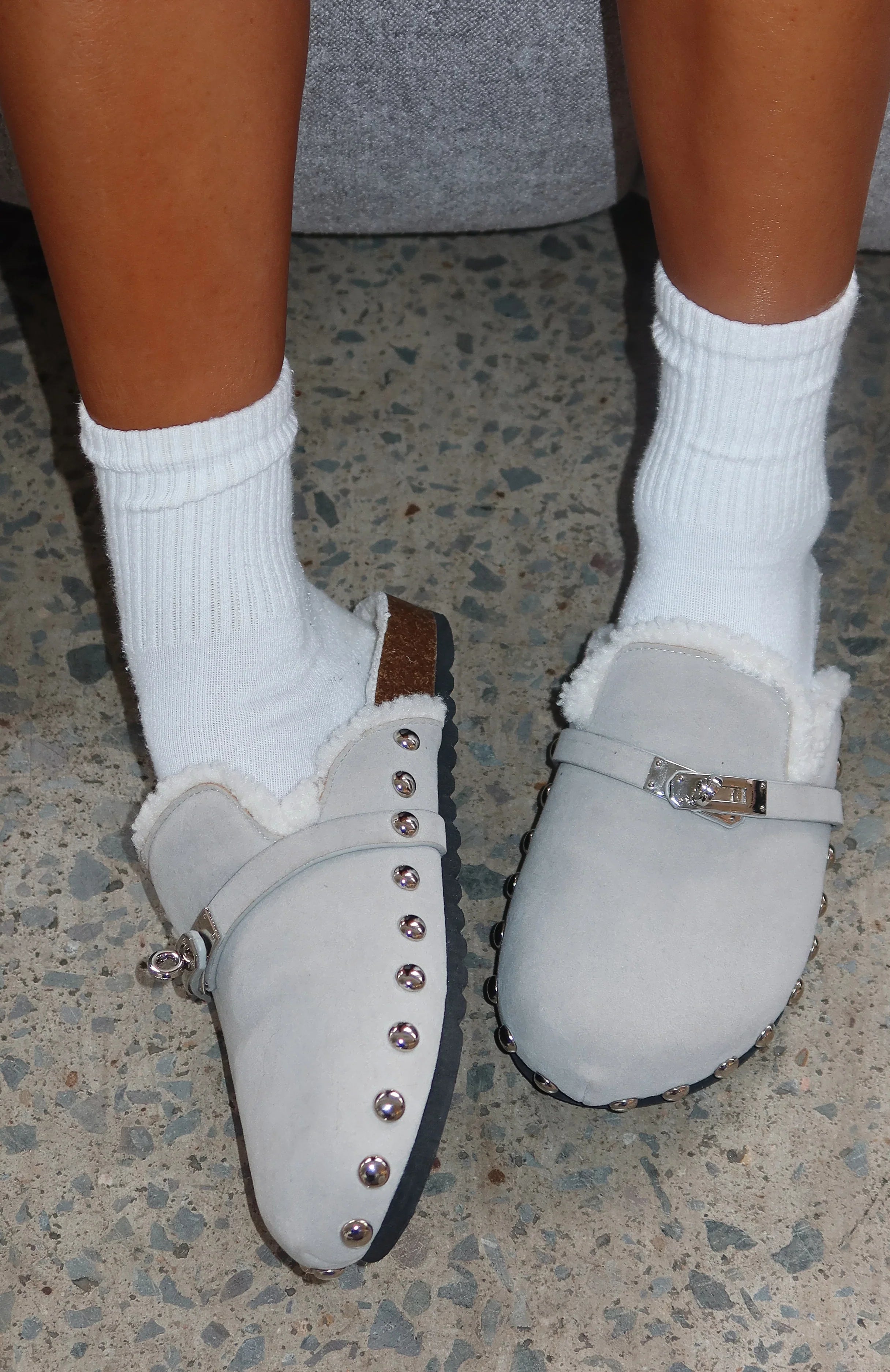 Finish off your cosy fit with the Asher Sandals in Stone! Features closed rounded toe, thick sole with stud detailing, front strap with silver hardware detailing, fur lining and open rounded heel. Pair with any lounge set for the perfect weekend fit!
