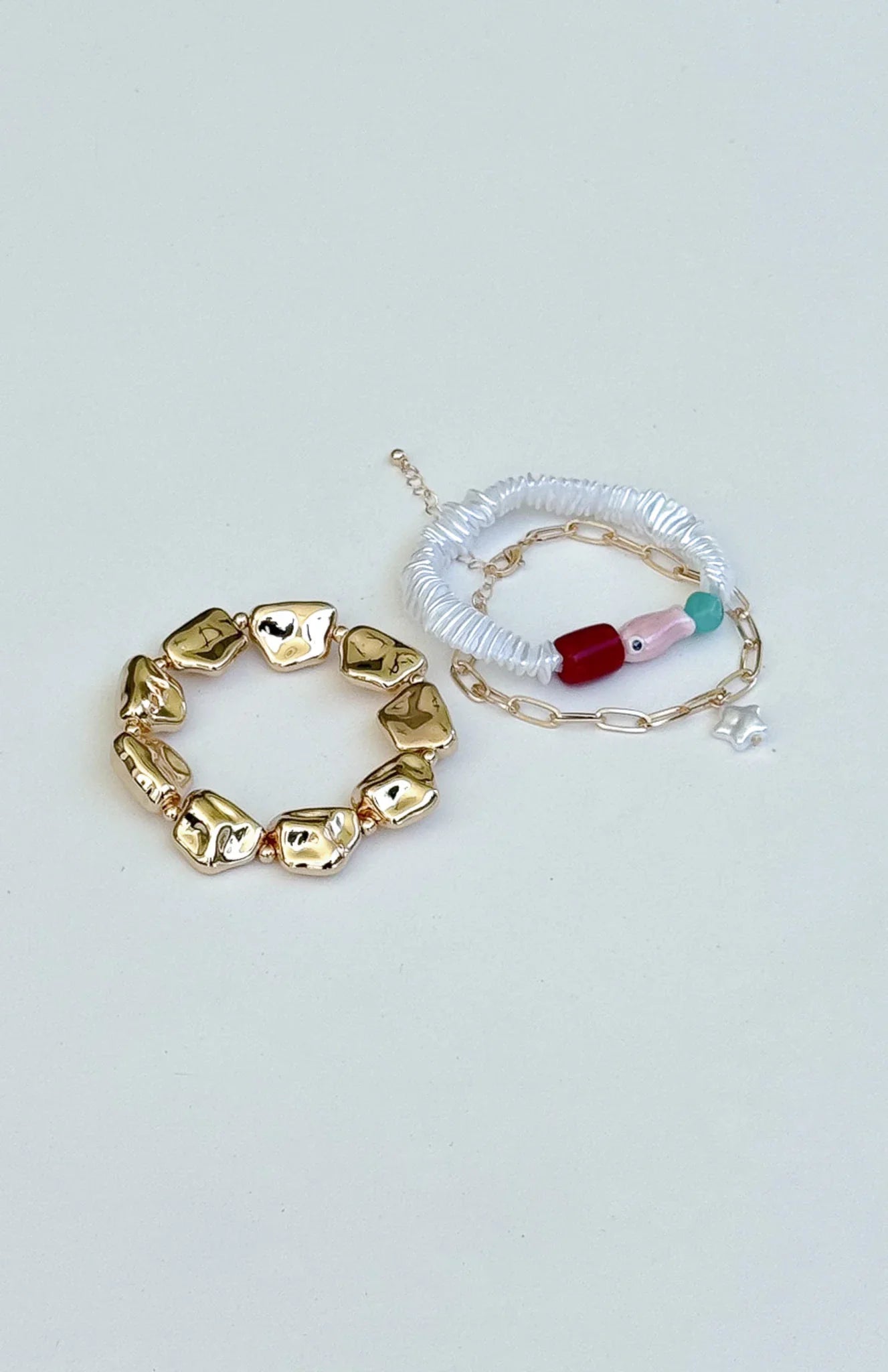Summer styling made effortless! The Aster Bracelet Set Gold features three bold bracelets. One in polished chain, one with pearl beads, and one in textured gold finish. Stack them over your favorite sun-dress for that instant IT-girl aesthetic.