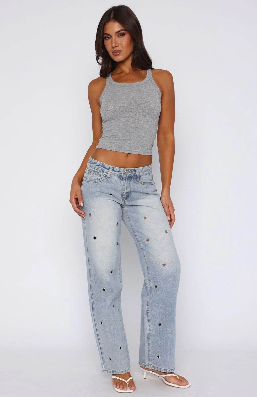 Cool girls spice up their denim rotation! The Athina Low Rise Wide Leg Jeans in Light Blue features a button and zipper closure centre front, belt loops, 5 pocket design, sliver eyelet detailing over jean front and faux leather White Fox label side back. To achieve the perfect balance between casual and cool pair with a basic tank and kitten heels.