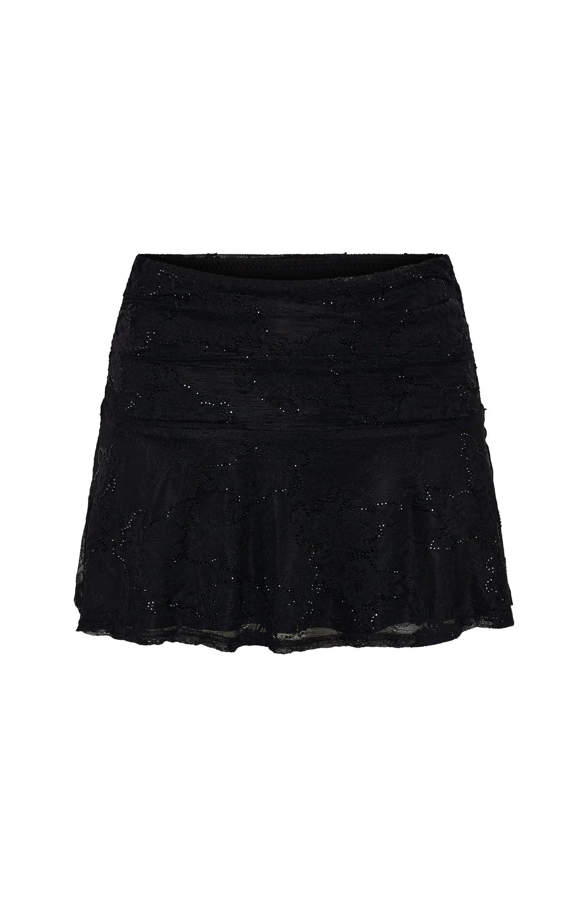 All in the details. The Be Our Guest Embellished Lace Mini Skirt Black features a thin elasticated waistband, refined side‑ruched detailing, lace fabric enhanced with sparkling diamanté accents and is fully lined. Style with the matching Always Stay Embellished Lace Long Sleeve Top and kitten heels for a flirty look.