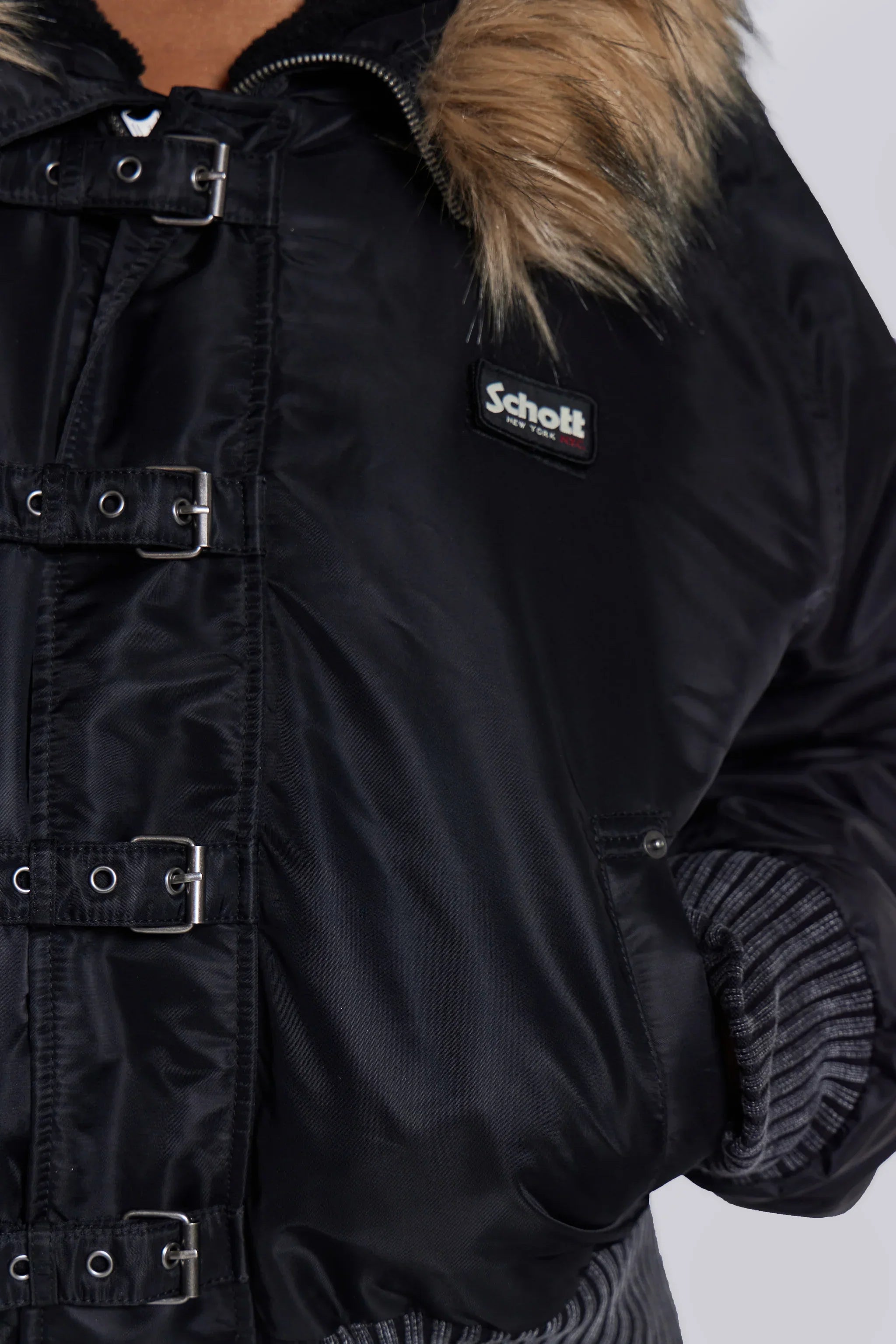 Designed in collaboration with Schott NYC, this piece is part of an ultra-limited edition. Crafted from the original Schott fabrics, it features a slightly cropped body and a faux fur trim hood for refined sophistication. Finished with distinctive details like a zip split hood, short pile borg lining, and antique silver hardware, this timeless jacket will leave its mark.