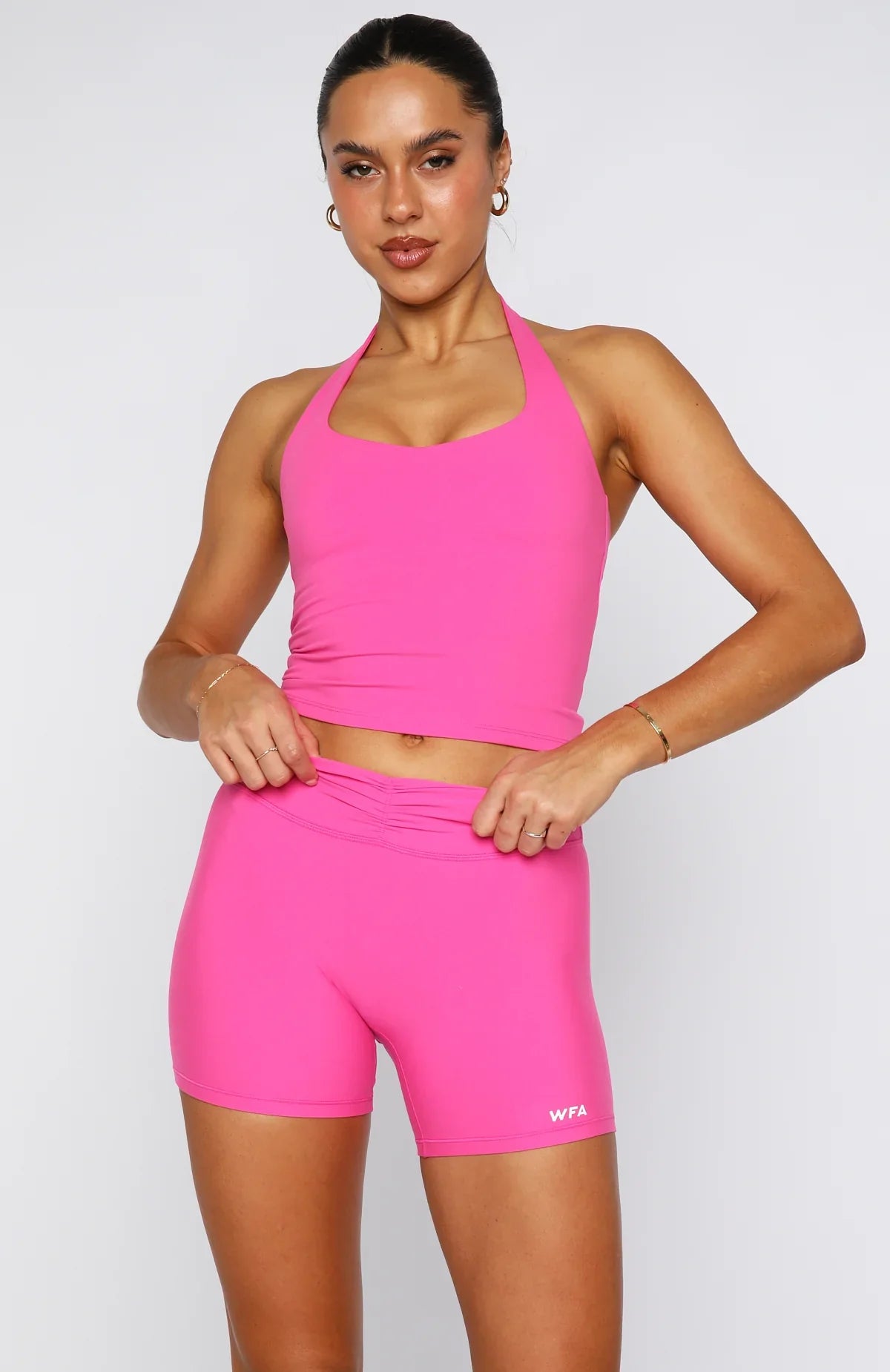 Ready to crush your next sweat session in style? The Body Pump Active Tank Bubblegum features a fixed halter strap, scoop neckline, thick stretchy straps, and a snug, lined fit with removable padding, an inbuilt crop for seamless support and WFA initials centre back. Pair with one of the matching Bubblegum WFA Bottoms.