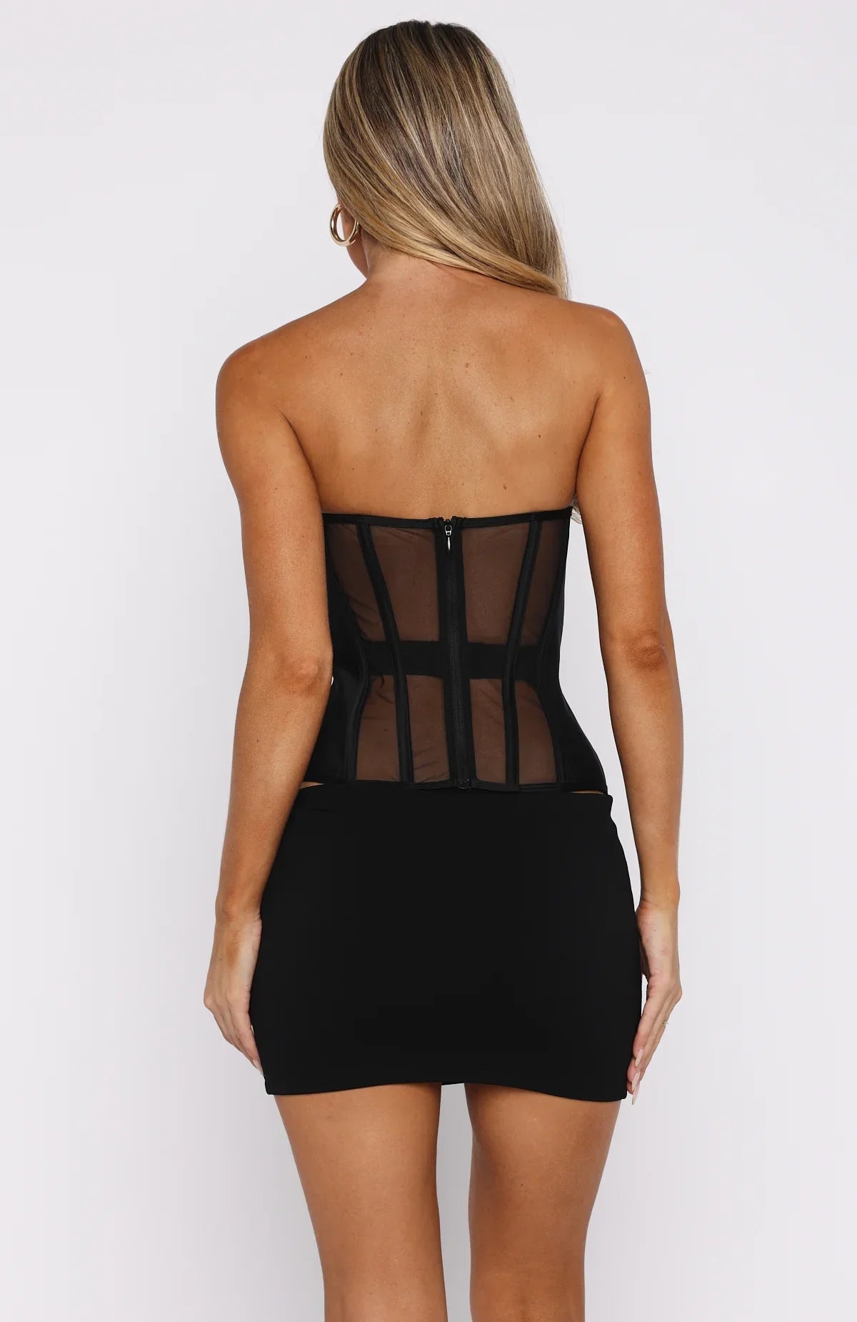 It's all about the birthday girl! The Call Me Your Baby Strapless Bustier Black features a strapless neckline featuring grip tape for secure wear, underwired bust cups, and structured boning throughout the bodice. Sheer front and back panels add a touch of allure, while an internal elastic waistband with hook-and-eye closure cinches the waist. Finished off with an invisible back zipper and lined at the bust for added comfort. Pair with sequin shorts and kitten heels to add sparkle to your ensemble.
