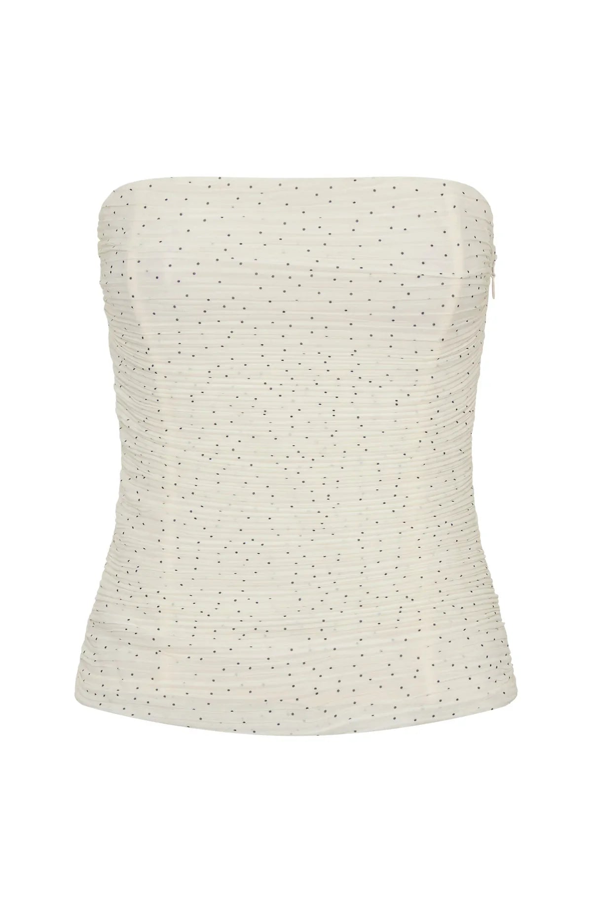 In a summer state of mind! The Camp Crush Strapless Bustier in Cream/Black Polka Dot features a strapless neckline with grip tape, internal boning, and subtle side ruching for a flattering fit. The fitted silhouette is complemented by an invisible side zipper with hook-and-eye closure, and the top is fully lined for comfort. Style with capris, kitten heels and sunnies for a chic summer fit.