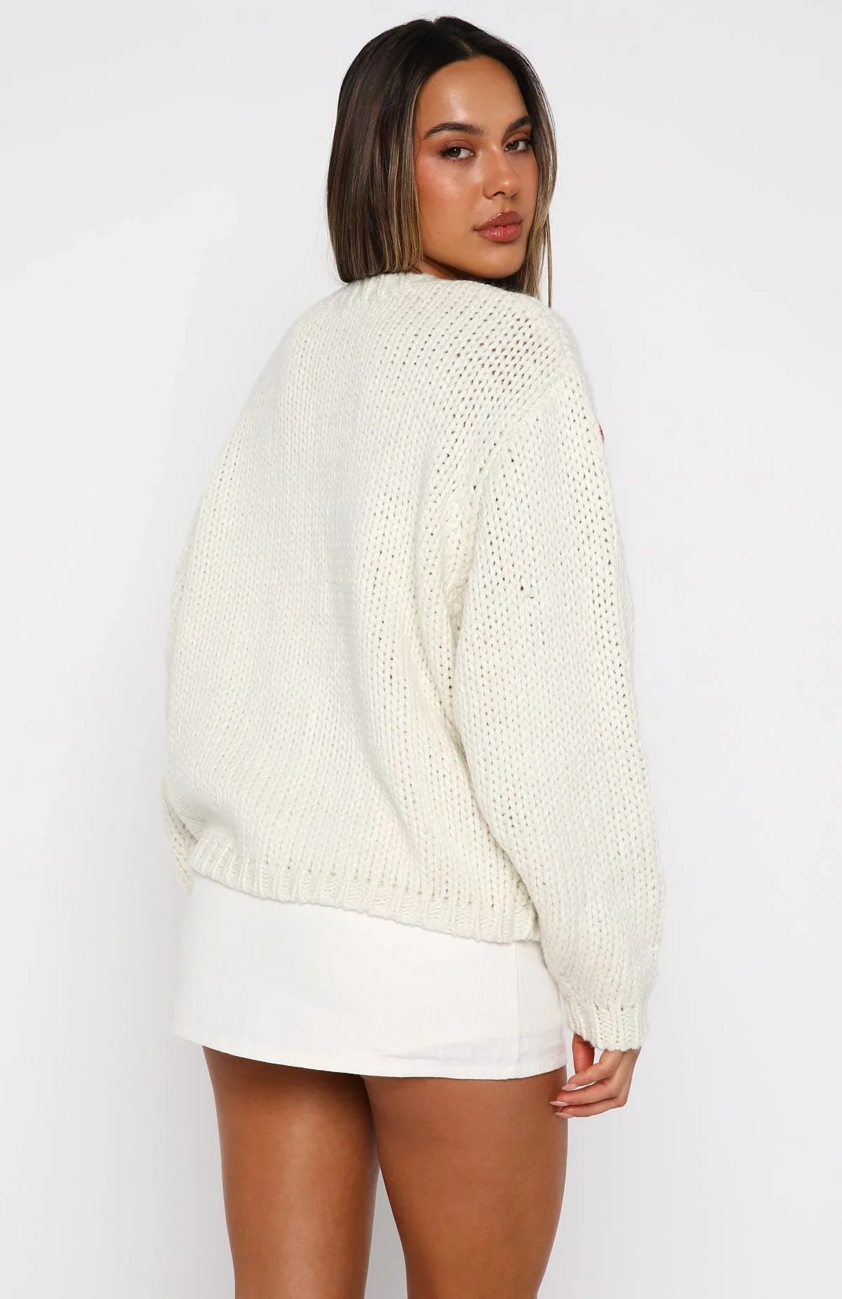 In Focus: Christmas Knitwear. The Candy Cane Crush Knit Sweater Cream features a classic crew neckline, slouched shoulders, and long sleeves with ribbed cuffs. This thick knit is finished with an oversized silhouette and statement oversized bow motifs scattered across the front. Style with a mini skirt for a merry blend of festive flair and relaxed style.