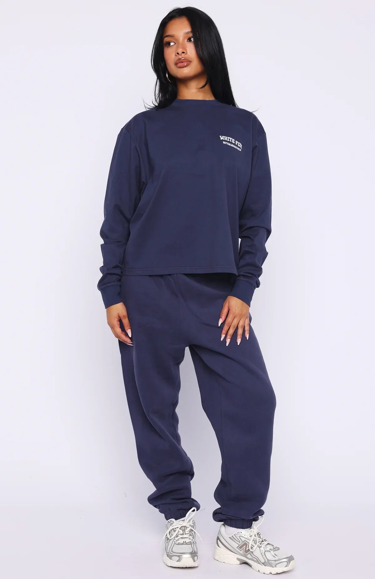 Where words fail, your fit speaks! The Can't Miss It Long Sleeve Tee Navy features a classic crew neckline, drop shoulders and rib-cuffed sleeves. This relaxed silhouette drapes casually and is finished with subtle White Fox embroidered side-front text. Style with the matching bottoms and your go-to sneakers for a cute casual fit.