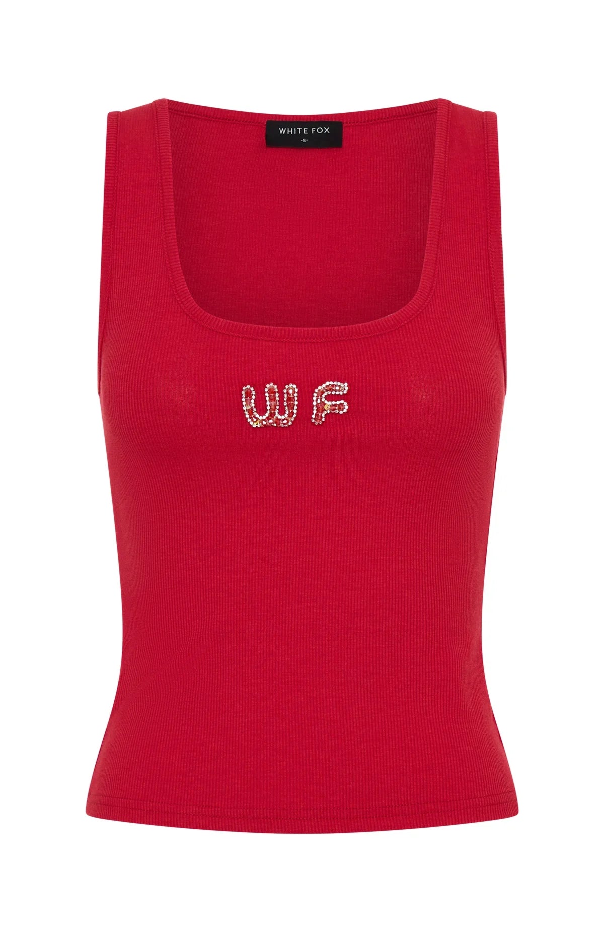 Rockin' around in the Catch Me Later Rib Tank in Red! Features thick shoulder straps, a scoop neckline, and beaded “WF” initials centre‑front, all in high‑stretch ribbed fabrication for comfort. Style with the Girly Things Sequin Mini Skirt in Red, statement heels and layered gold jewellery for a high shine xmas fit.