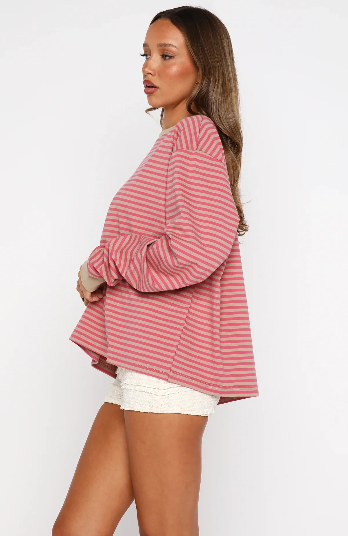 Newest obsession: stripes and they’ve never looked this good. The Catch The Drift Long Sleeve Tee in Pink/Stone Stripe features a classic crew neckline, slouch shoulders, long sleeves with ribbed cuffs, and a relaxed silhouette. Finished with a centre-back White Fox text for a statement touch. Style it with cosy pants, your fav sneakers, and sunnies for an effortlessly chill weekend look.