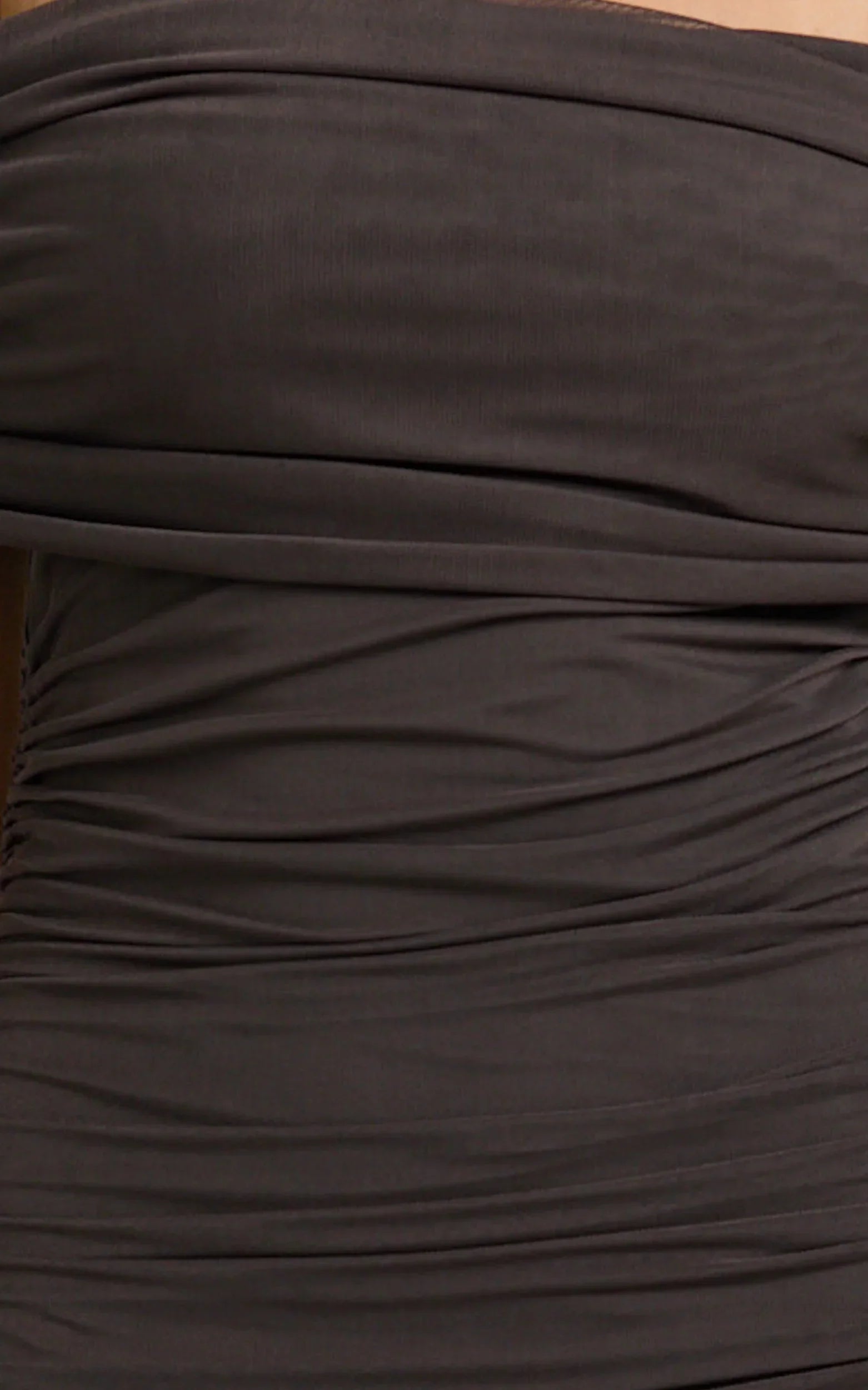 This off-shoulder ruched Dresses moment hugs in all the right places with a body-skimming mesh finish and a floor-sweeping silhouette made for date nights, cocktails, and every after-dark invite. The neckline sits just-so to frame your collarbones, while the all-over ruching sculpts and flatters from every angle, hello, confidence. Think sultry yet polished, with a rich brown tone that taps into evening glamour and is trending hard right now.