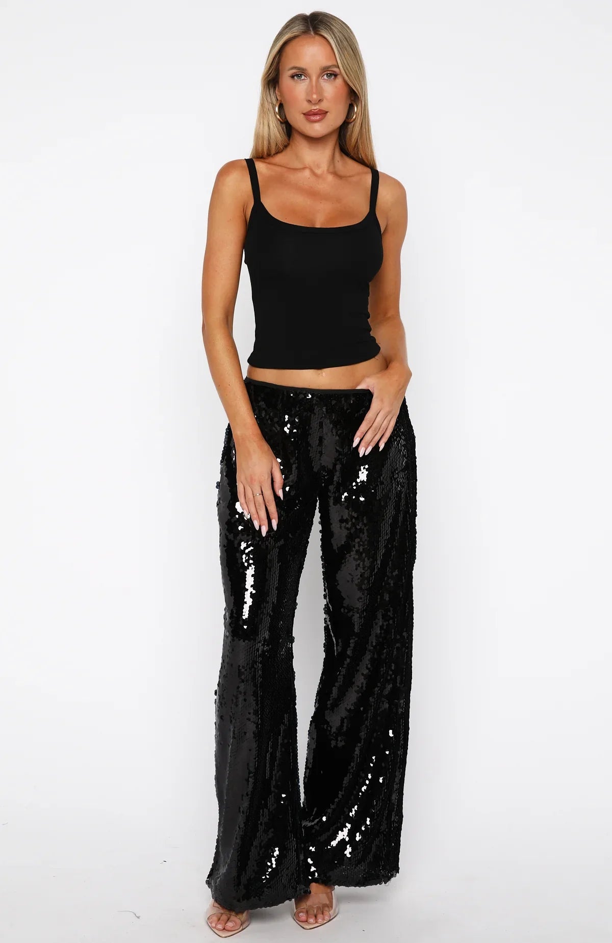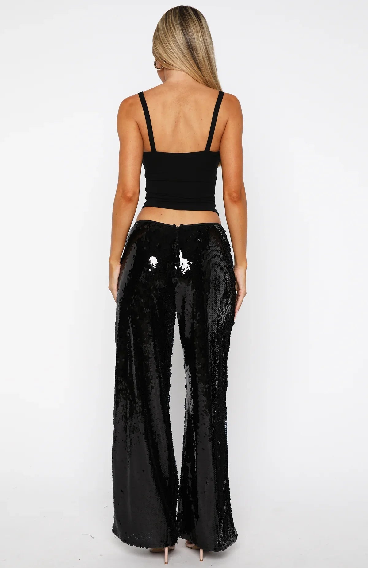 Add some sparkle to your wardrobe with the Caught Up In It Sequin Pants in Black. These pants feature all-over sequin detailing, a semi-sheer fabrication, and a wide-leg fit for a glamorous look. The visible zipper and hook-and-eye closure ensure a secure fit. Pair them with your favourite jacket, kitten heels, and gold accessories for a chic ensemble that turns heads.