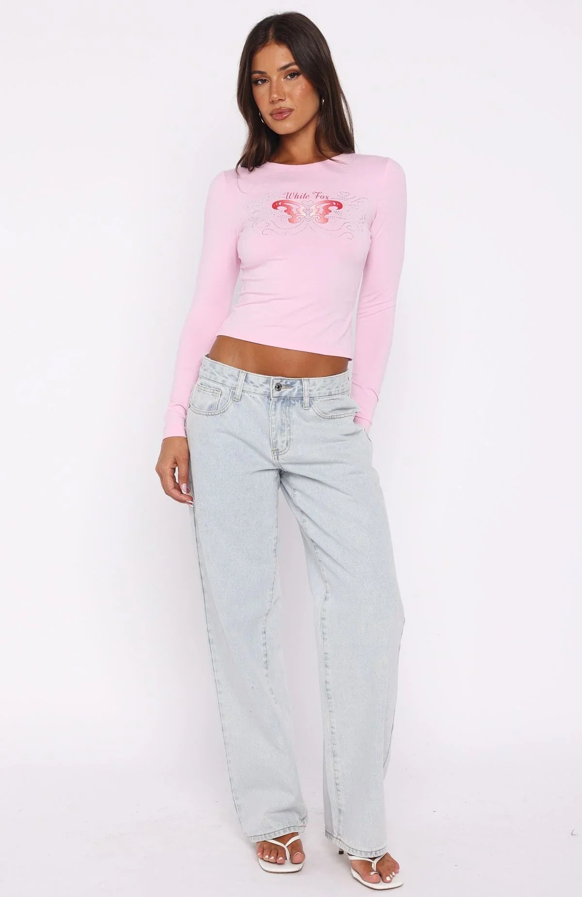 Capture attention from every angle in the Chasing Butterflies Long Sleeve Baby Tee in Pink! Features a classic crew neckline, slim-fitting long sleeves, and a sleek, semi-stretch silhouette. Adorned with White Fox text and a delicate butterfly graphic enhanced by dominates, it strikes the perfect balance between understated cool and whimsical flair. Style with lounge shorts and your fav sneakers for a comfy edge to your casual weekend fits.