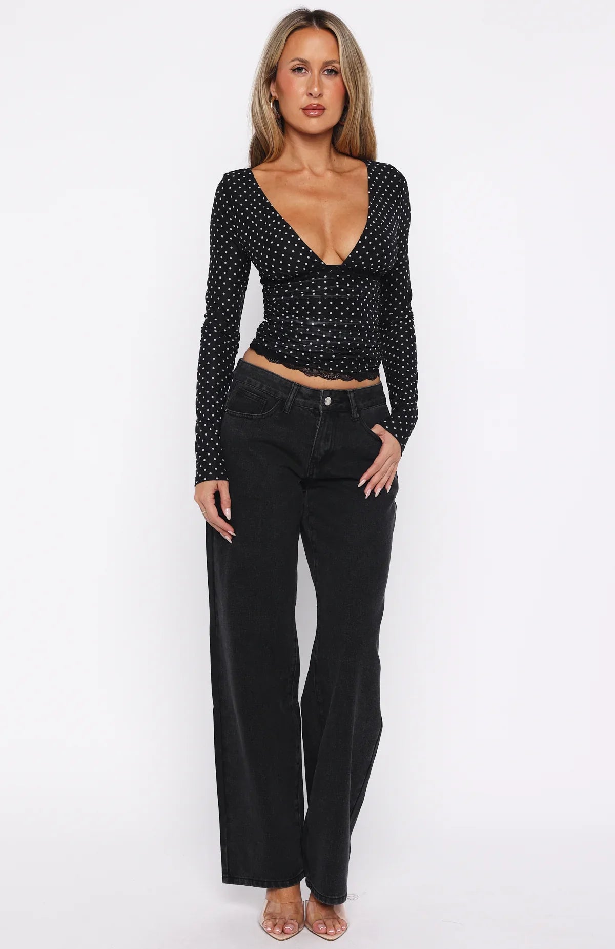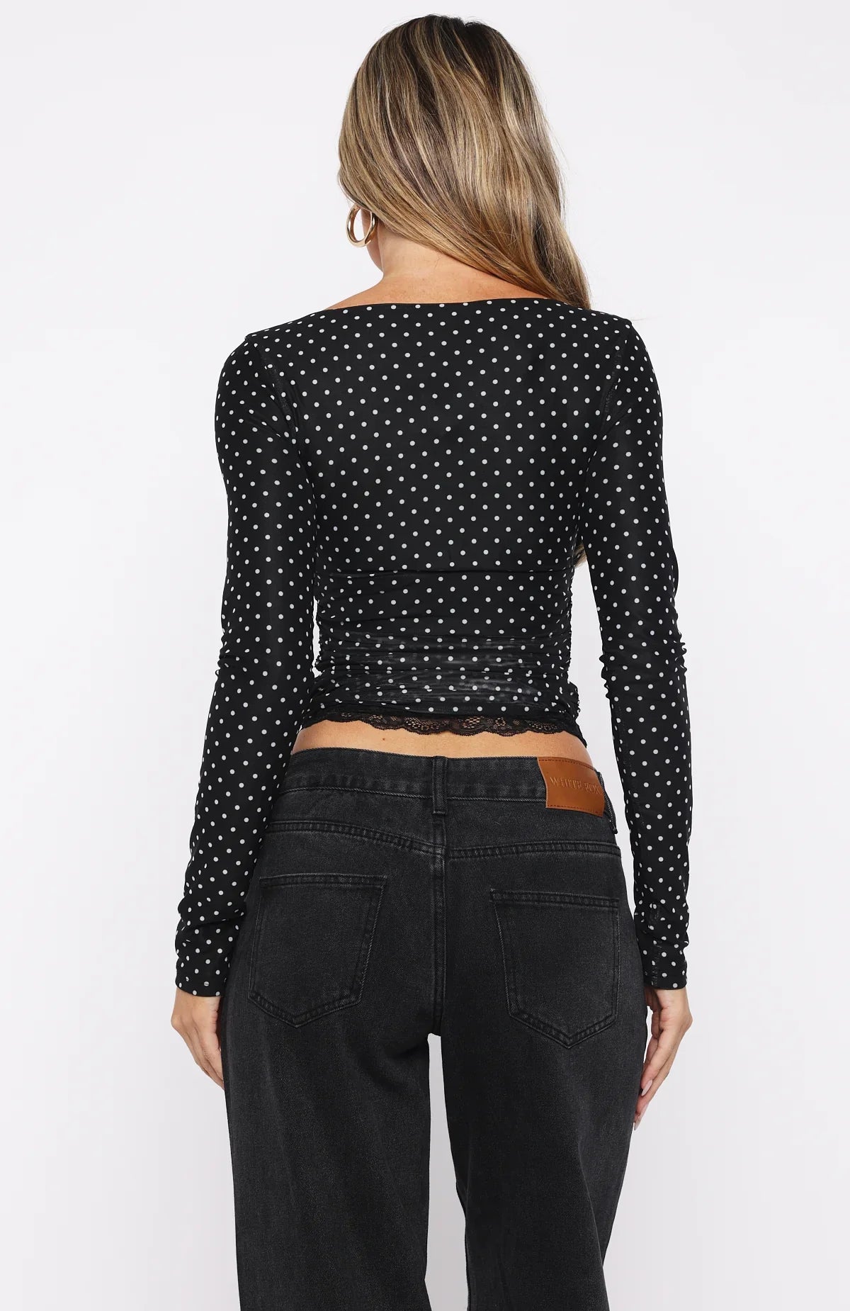Outfit game strong in the Clear As Day Long Sleeve Top Black/White Polka Dot. Features a flattering V‑neckline, fitted silhouette and soft stretch fabrication for an easy, shape‑hugging fit. Lace detailing under the bust and side ruching add subtle texture, while the long sleeves and full lining keep things sleek. Style with your got-to denim jeans and kitten heels for a cute winters night out look.
