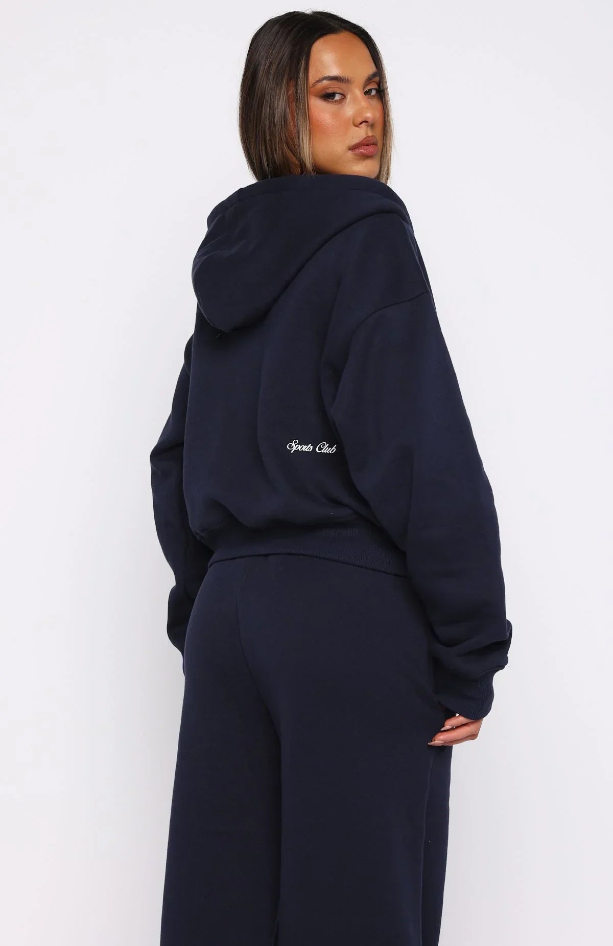 We followed our hearts, and it led us to the Club 14 Allie Boxy Zip Front Hoodie in Navy! Features a relaxed hood, boxy fit, long sleeves, front pocket, ribbed cuffs and hem band, and a double-ended centre-front zipper. Finished with puff print White Fox text centre front, paired with subtle cursive puff print Sports Club text side back. Complete the look with the matching Club 14 Allie Wide Leg Sweatpants.