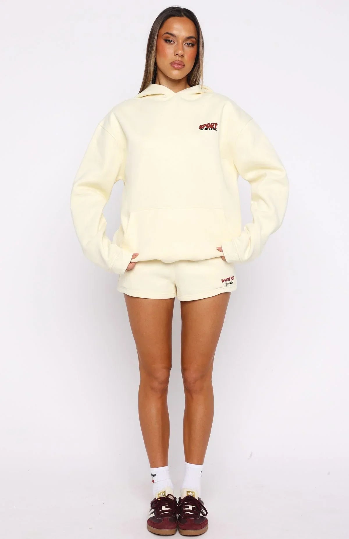 Weekend Dress Code! The Club 14 Izzy Lounge Shorts Lemon are designed with a thin elasticated waistband featuring an internal drawstring tie, side hip pockets, and a relaxed silhouette. The White Fox puff print text at the side adds a signature touch, while the unlined fleece interior ensures a cozy feel. Pair with the matching Club 14 Izzy Oversized Tee or Club 14 Peyton Oversized Hoodie for colder days.