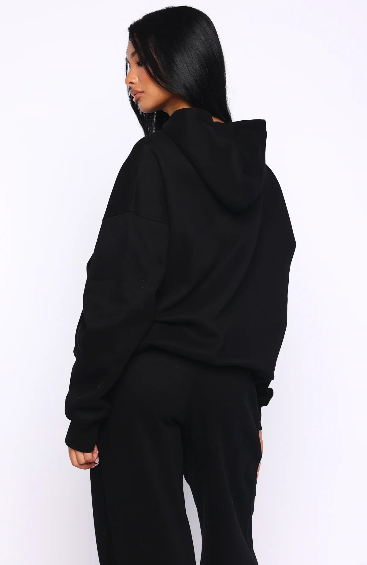 Loungewear weather state of mind. The Come A Long Way Oversized Hoodie Black is designed with a double lined hood, slouched shoulders and firm ribbed hems which round out an oversized silhouette. Featuring long sleeves, a roomy front pocket, and an unlined fleece interior, this hoodie delivers a cozy feel. Finished with White Fox embroidered lettering centre front. Style with the matching Come A Long Way Wide Leg Sweatpants and slippers for a cosy Sunday look.