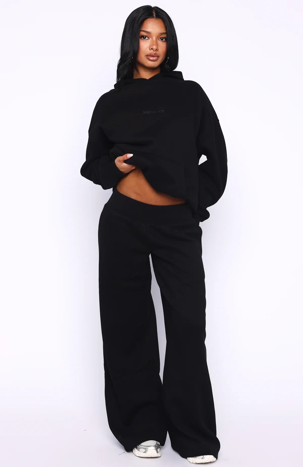 Slip into Come A Long Way Wide Leg Sweatpants in Black and redefine cosy-chic. These effortless sweats feature a thick elasticated waistband and stitched "White Fox" text along the side front. The flowing wide-leg cut offers laid-back comfort, while unlined ensures loungy softness all day. Pair with the Come A Long Way Oversized Hoodie Black for matching ease-meets-style energy.
