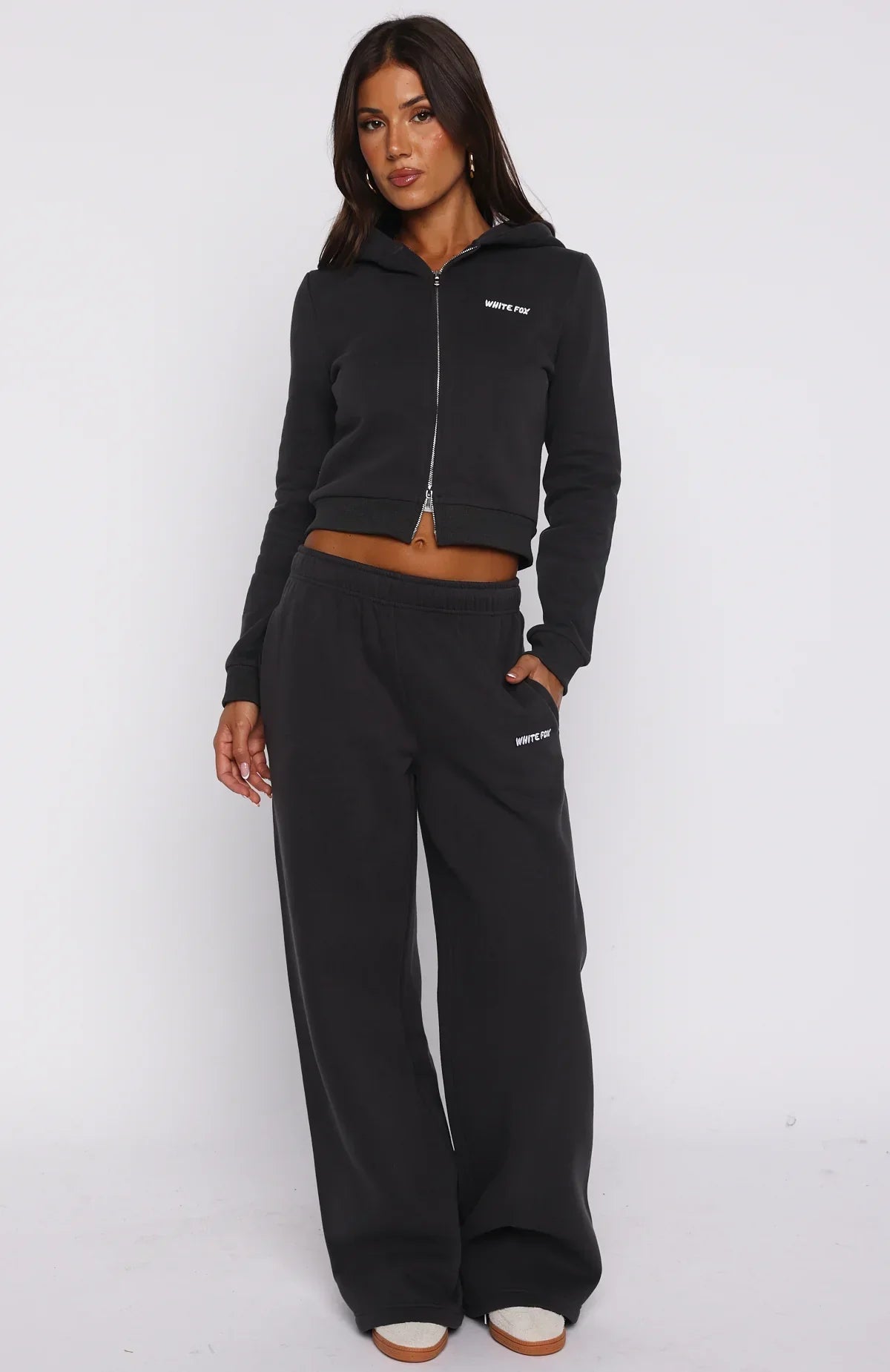 Your new go-to for laid-back luxe. The Comfy And Cute Slim Zip Front Hoodie Charcoal is designed with a relaxed hood, slouched shoulders and ribbed hems which round out an slim silhouette. Featuring long sleeves, front zipper closure, and an unlined fleece interior, this hoodie delivers a cozy feel. White Fox embroidered text embellishes the side front. Style with the matching Comfy And Cute Wide Leg Sweatpants Charcoal.