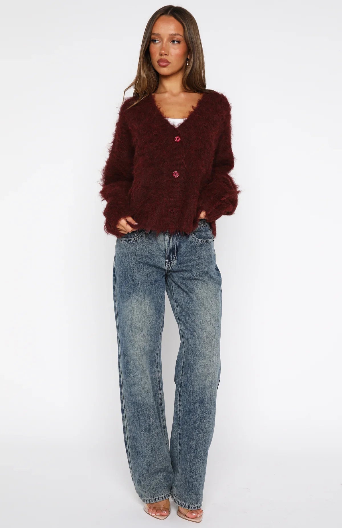 Join the cardi club in the cosy Cozy Vibes Knit Cardigan Bordeaux. Crafted from knit fabrication this cardigan features softly slouched shoulders, a flattering V-neckline, button down closure and long sleeves featured with ribbed cuffs. Wear it over your favorite denim and boots for that laid‑back, autumn‑perfect vibe.