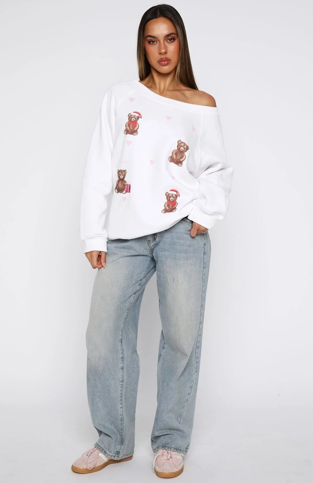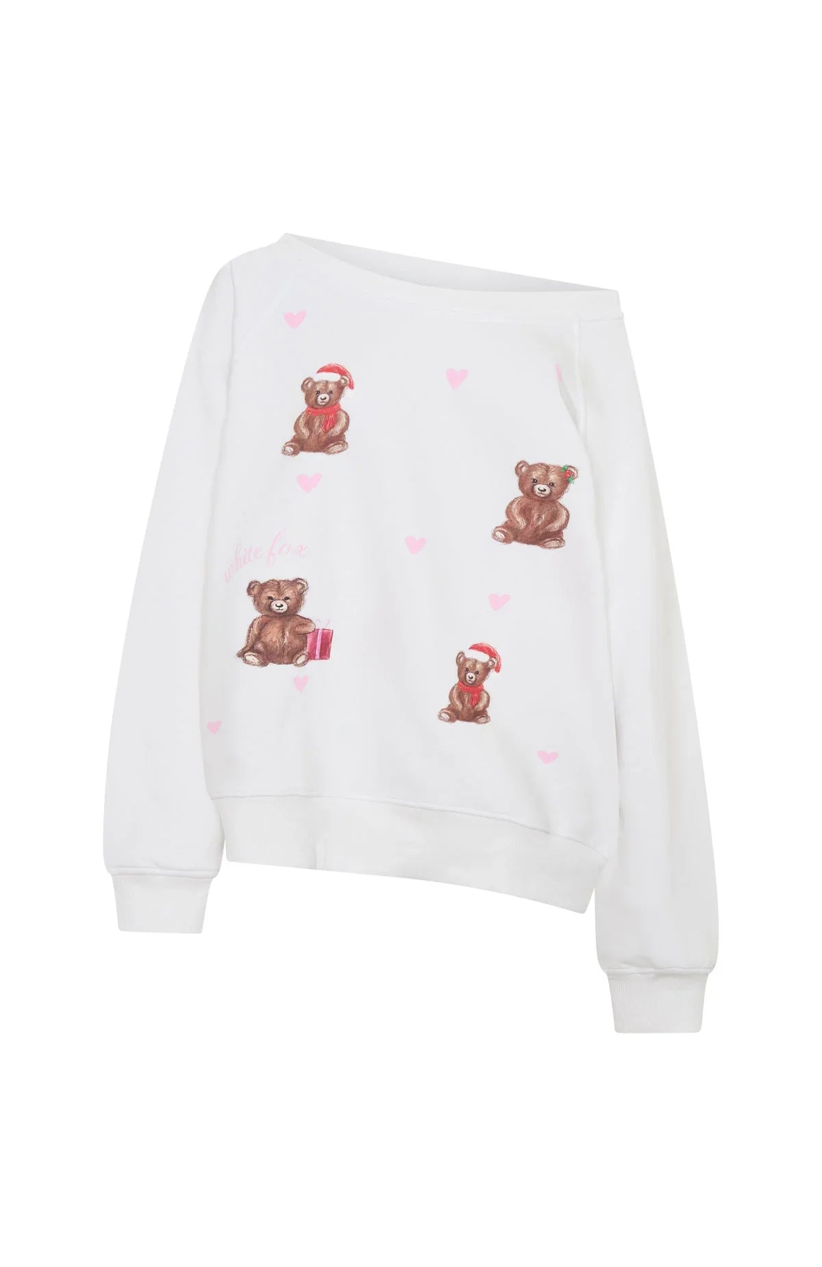Bring festive flair to your holiday gatherings with the Cuddly Christmas Off Shoulder Sweater in White. This cozy piece features a relaxed off-shoulder neckline, ribbed cuffs, hem, and neckline, and a playful printed teddy bear graphic with "White Fox" text. Its oversized fit and soft fleece interior ensure comfort and warmth. Pair it with the Cuddly & Cosy Pyjama Pants in Sweet Teddy and slippers for the perfect Christmas loungewear ensemble.
