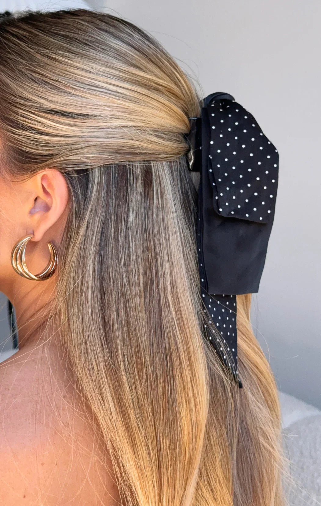 Achieve old-money vibes with the Dalary Hair Clip in Black Polka Dots. Features a dainty fabric bow in a classic polka dot pattern, secured by a secure claw clip for timeless style and everyday ease.