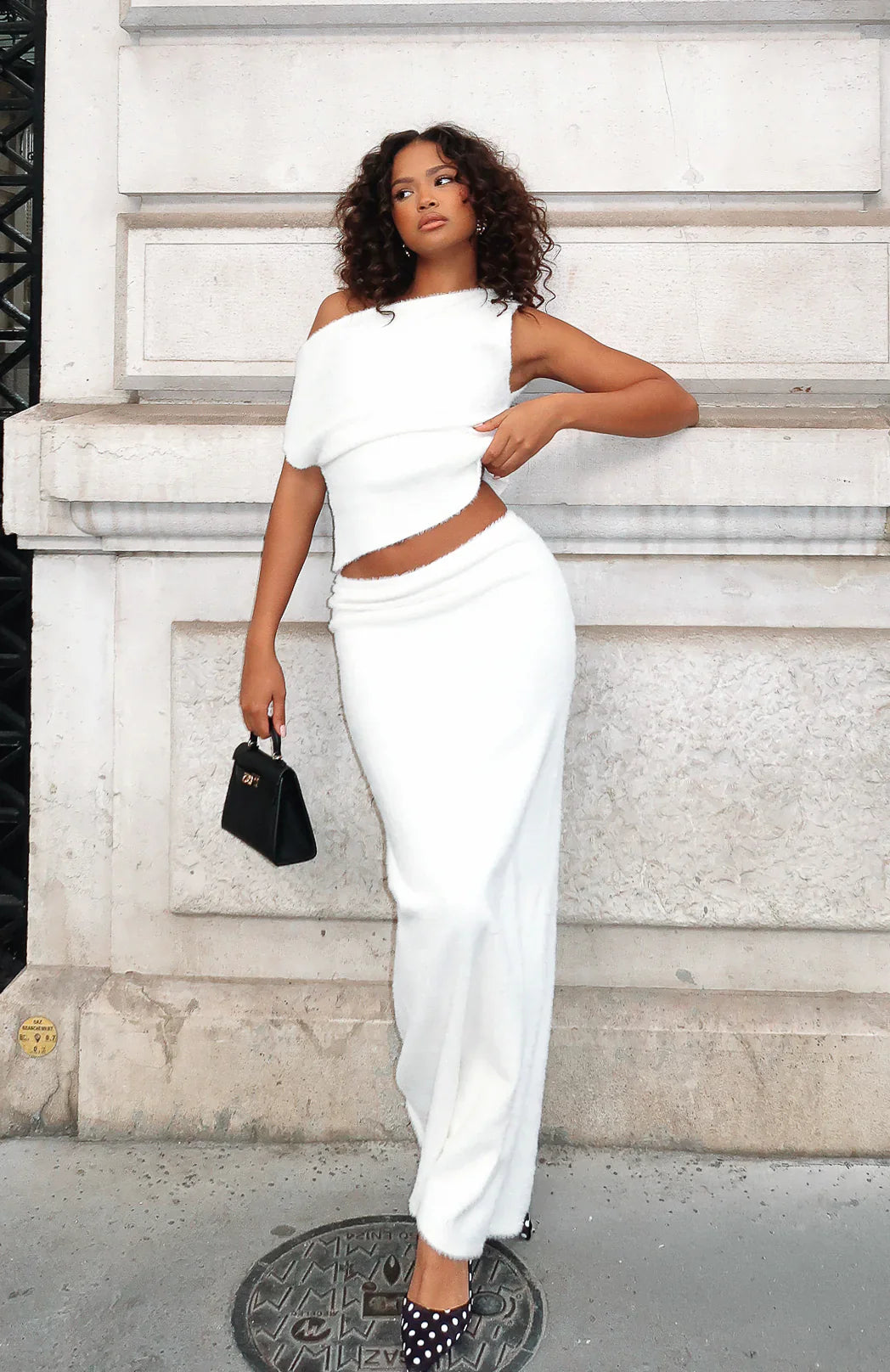 Embrace a monochrome moment with the Dancing At Night Knit Maxi Skirt in Snow. This unlined, figure-skimming piece features a soft, fluffy knit and a thin elastic waistband, offering both comfort and style. Pair it with the matching Dancing At Night Knit Top Snow for a coordinated look that exudes effortless elegance.