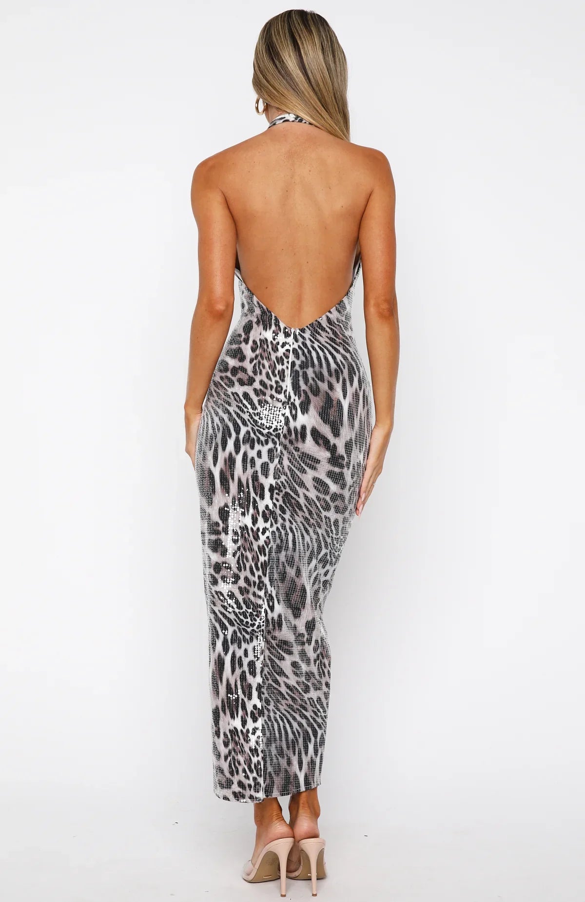 Be unapologetically dazzling in our Dancing In The Dark Sequin Maxi Dress in Savage Allure. Designed with elegant halter straps with button fastening at the nape, a plunging neckline, figure‑skimming silhouette, full sequin fabric, invisible back zipper with hook‑and‑eye closure, full lining and a back hem split for dramatic movement. Style with clear heels, layered gold jewellery and a coat for colder nights.