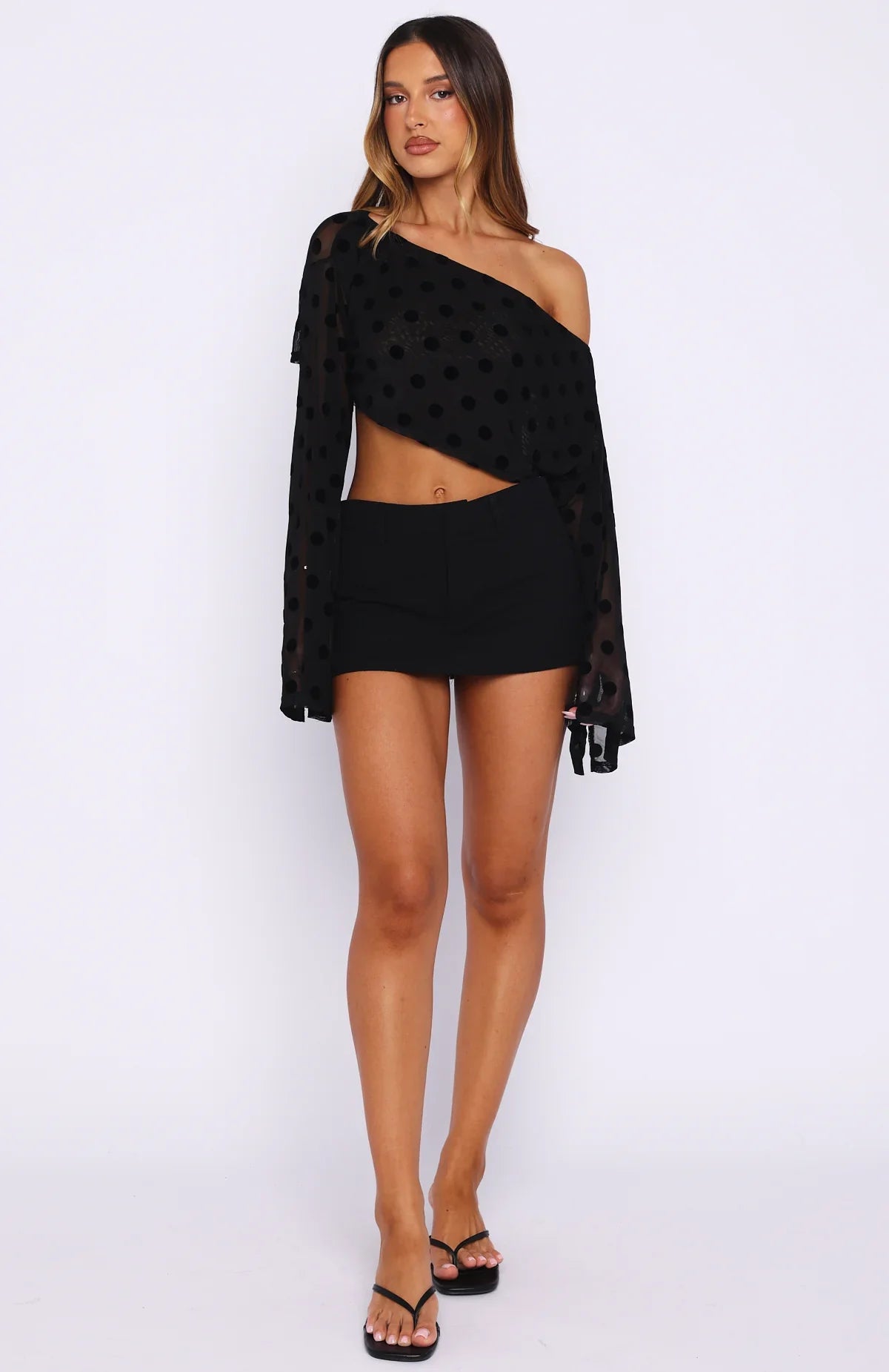 Poolside lounging in the Deep Dreamer Long Sleeve Top in Black Polka Dot! Features a off the shoulder neckline, split-cuff long sleeves, and a cropped silhouette, crafted in sheer fabric with velvet polka dots. Style with mini shorts, wedges and chunky gold jewellery for a summer night out fit.