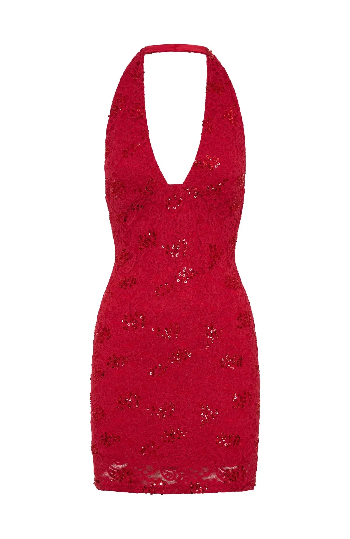 Turn heads at the Eiffel Tower in the Disco Damage Lace Mini Dress in Red. This sultry piece features fixed halter straps and a plunging neckline adorned with delicate lace trim. Its figure-hugging silhouette is crafted from intricate lace fabric, enhanced with shimmering beaded detailing and finished with full lining for comfort. Wear bold heels, grab that eye-catching bag and layer gold jewellery...you're ready.