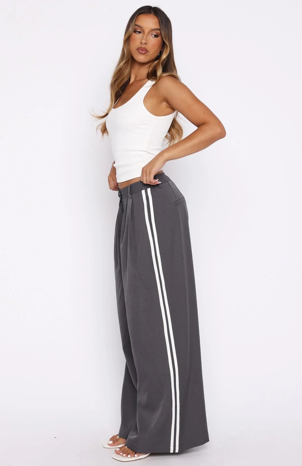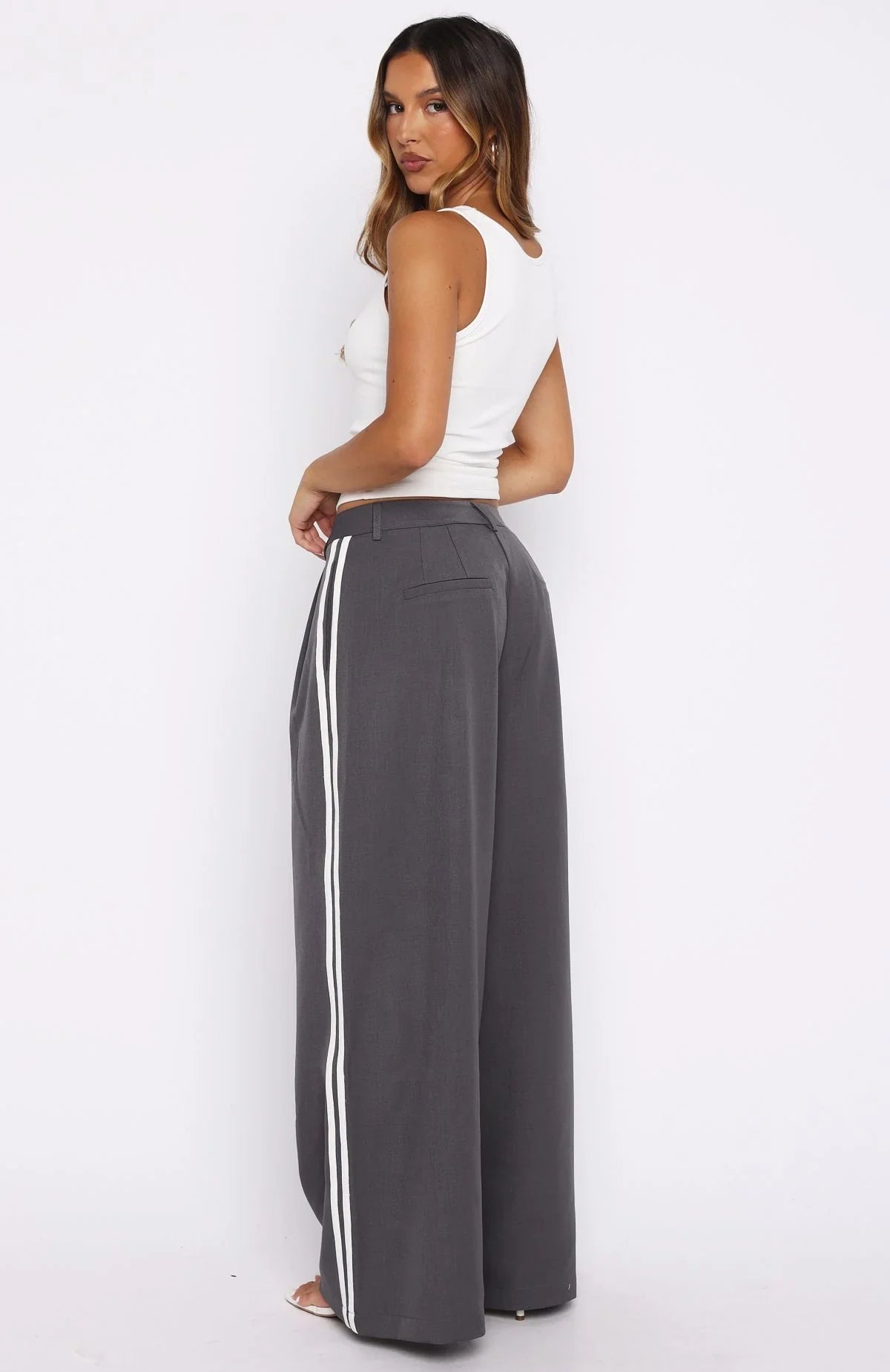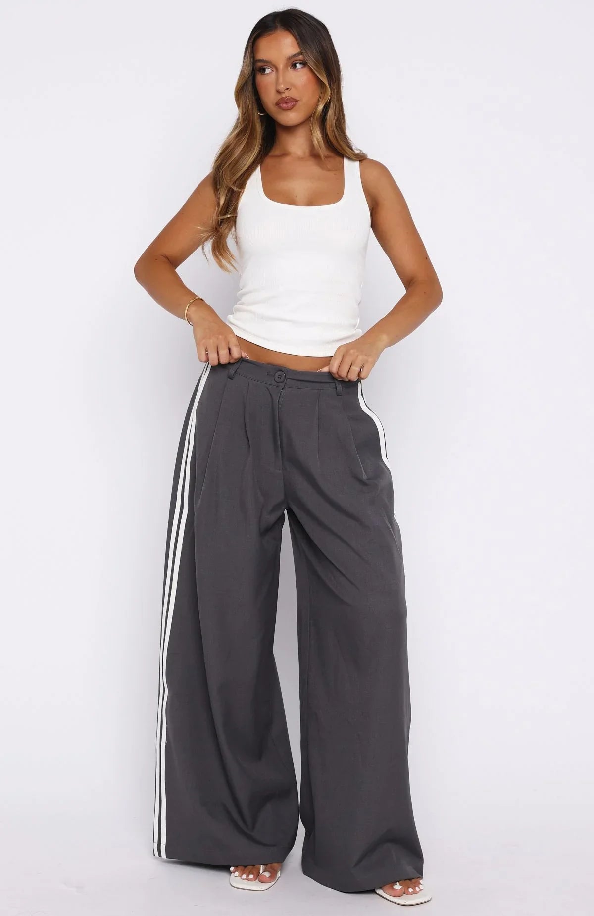 Bring a fresh look to your winter wardrobe with the Don't Believe It Pants in Charcoal features thick waistband with button and zipper closure centre front, belt loops, side pockets and faux back pockets and wide leg design with double stripe detailing down side. For a laid back vibe pair with a basic tank, sunnies and flats.