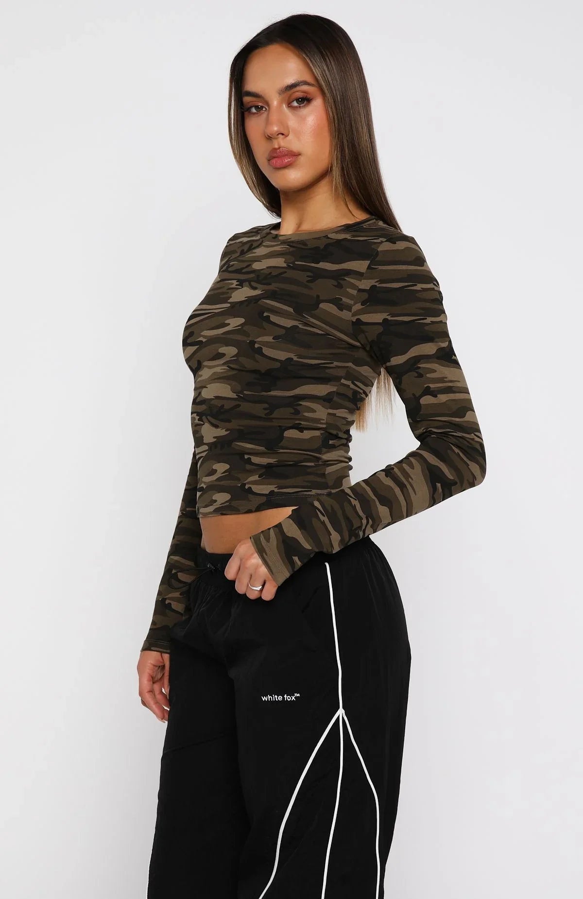 Cool girl vibes only! The Don't Rein Me In Long Sleeve Baby Tee in Camo features a classic crew neckline, long sleeves, and a fitted silhouette. Crafted from high-stretch, unlined fabric, this top if finished off with camo print for touch of edge. Style with casual pants, your fave sneaker and layered gold jewellery for a cool fit.