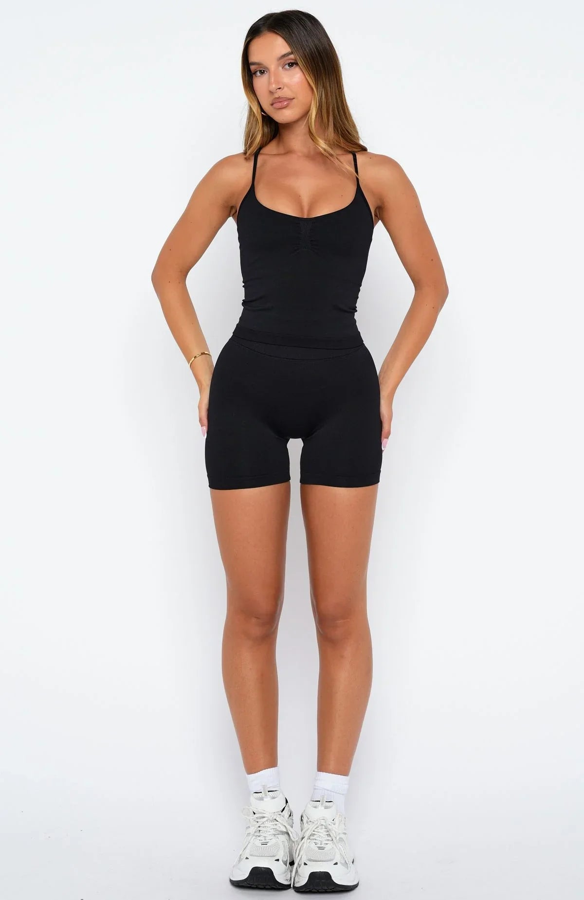 Cute, comfy, and ready to keep up with your every move! The Drift Seamless Active Tank in Black features thin, adjustable shoulder straps with a back cross over design, built in bra with removable padding for a supportive fit, unlined, stretch material that moves with your body, and elasticated detailing at centre bust. Pair with the matching Zoom Seamless Shorts 4" or Charge Seamless Leggings for your next sweat sesh look!
