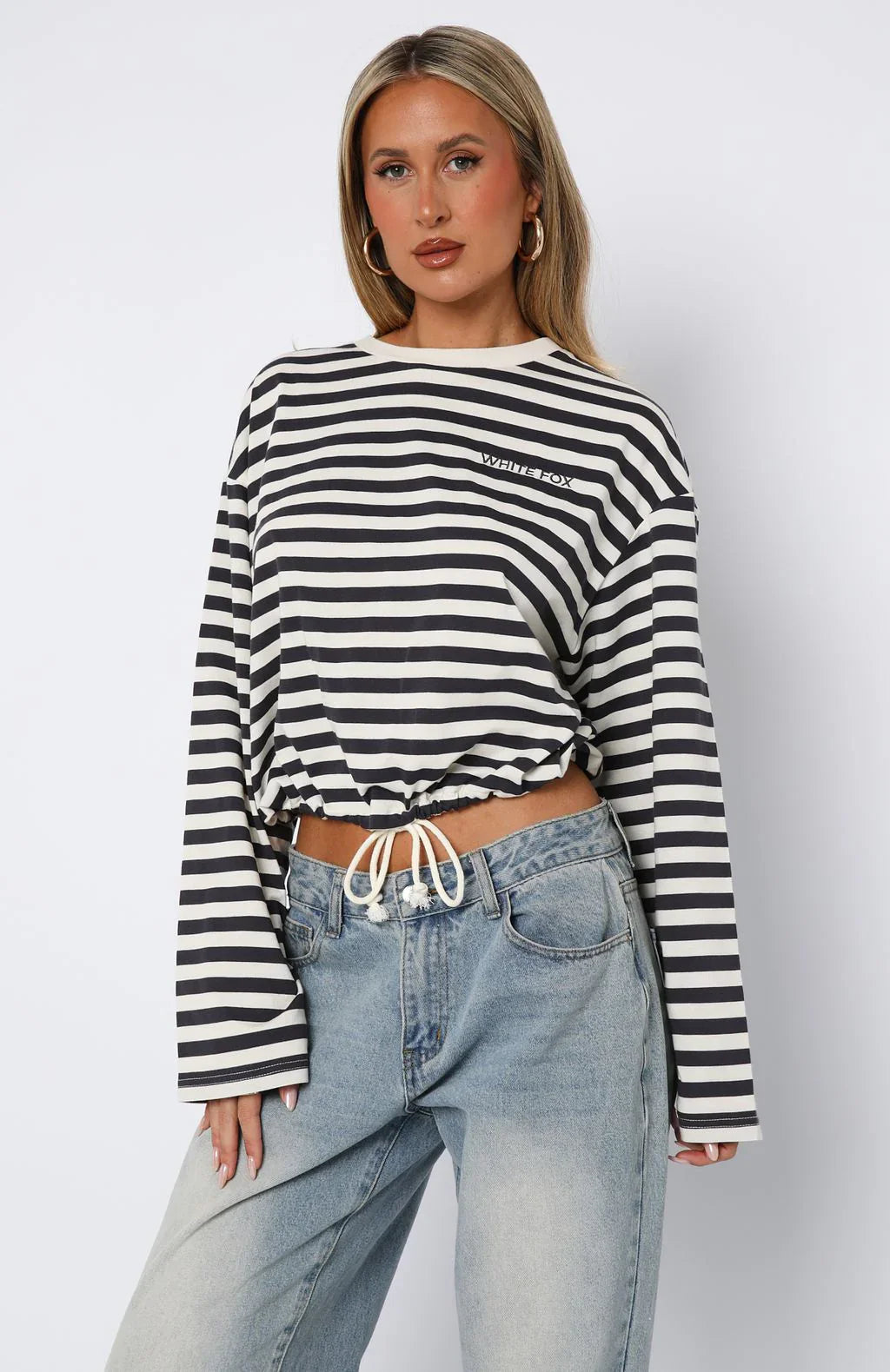 Introducing your newest winter essential - First Time Here Long Sleeve Tee in Pink/Cream Stripe! Features a round neckline, wide long sleeves, stitched White Fox text side front and drawstring hemline for a subtle cropped fit. Effortlessly pair with your fav White Fox denim jeans and sneaker for the perfect weekend coffee date fit!