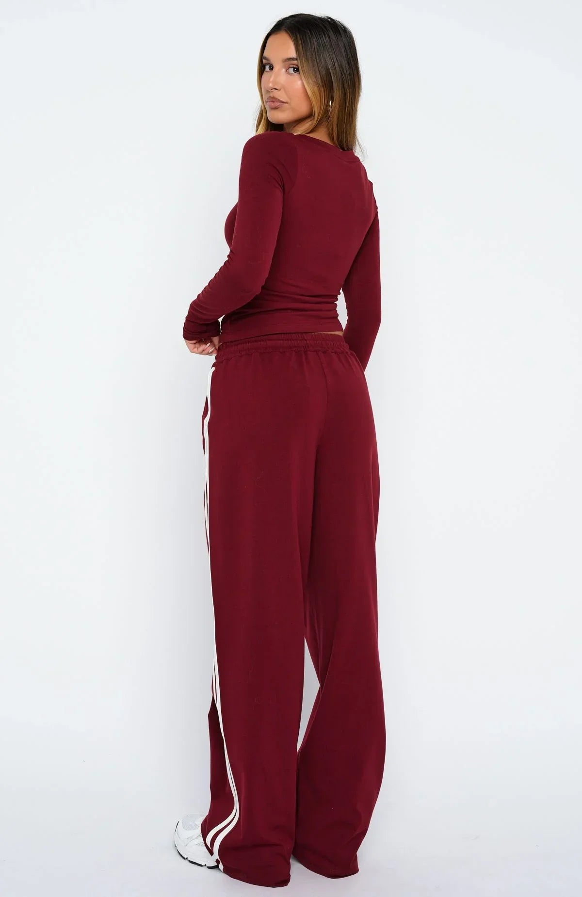 This colour combo makes casual look instantly cool! The Found You Out Track Pants Burgundy feature a thick elasticated waistband with drawstring ties, wide leg design, panel fabrication on side and White Fox text side front. Have a five star quality fit by pairing with the matching Found You Out Long Sleeve Top Burgundy .