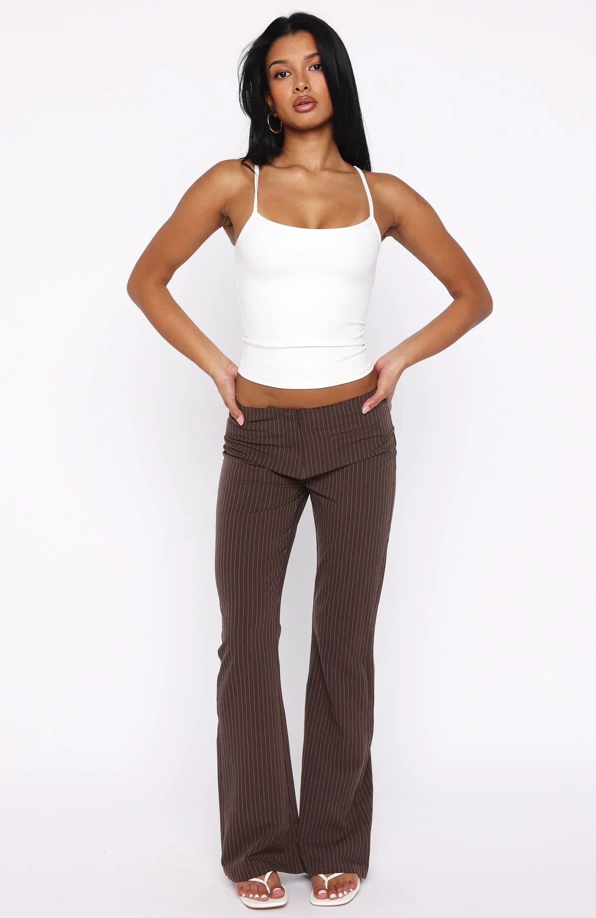 Effortlessly refined and quietly confident, introducing the Getting You Close Pants in Chocolate Pinstripe. These tailored pants feature a frayed waist hem, clean front zipper with hook-and-bar closure, and a sleek straight-leg silhouette framed by faux side pocket. Unlined for a lighter finish, they pair perfectly with a minimalist tank, kitten heels, and layered gold jewelry.