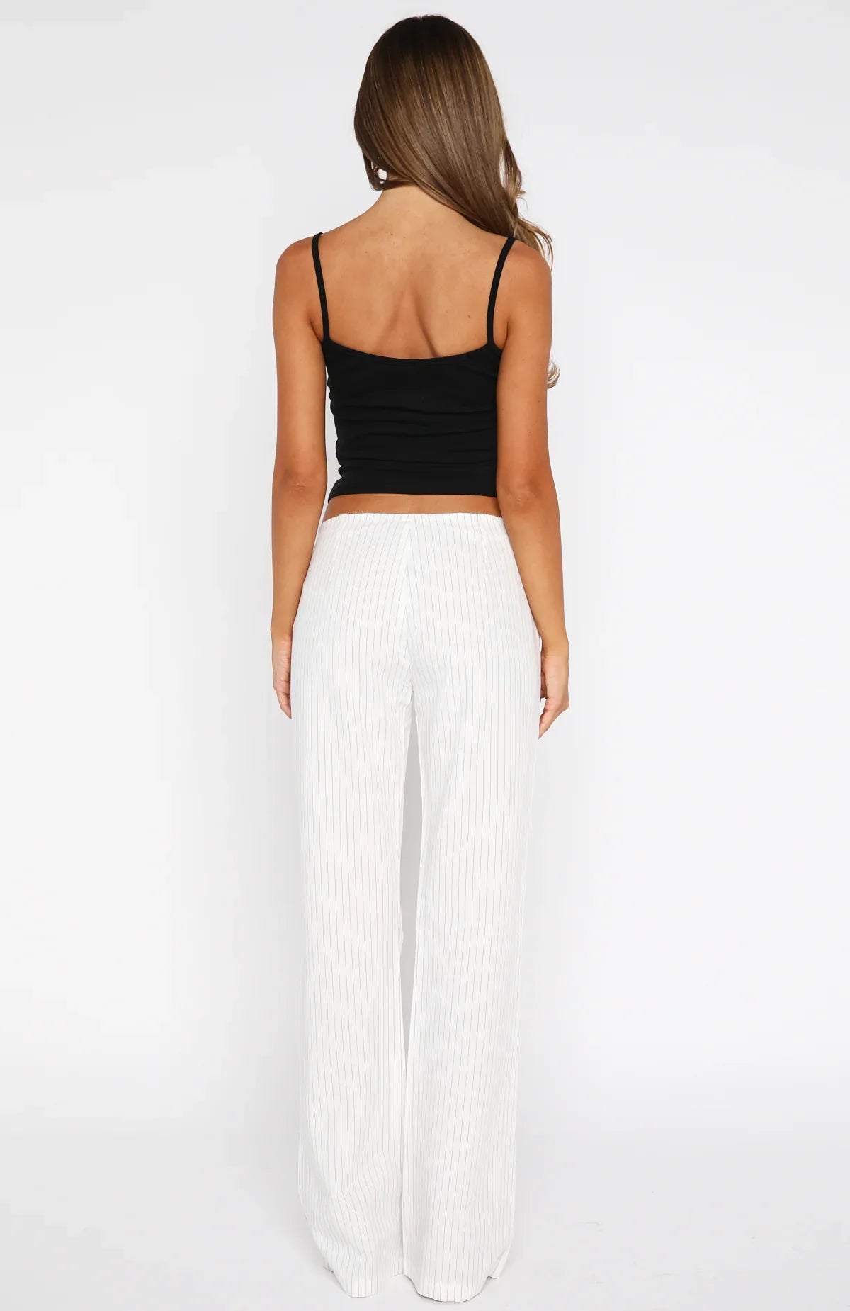 Effortlessly refined and quietly confident, introducing the Getting You Close Pants in White Pinstripe. These tailored pants feature a frayed waist hem, clean front zipper with hook-and-bar closure, and a sleek straight-leg silhouette framed by faux side pocket. Unlined for a lighter finish, they pair perfectly with a minimalist tank, kitten heels, and layered gold jewelry.
