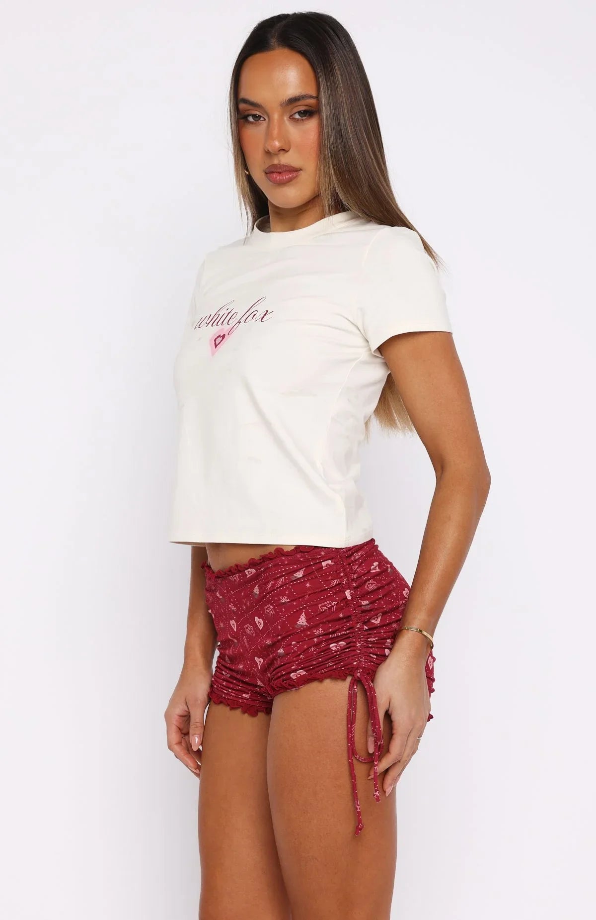 Santa’s little sweetheart just found her perfect PJ set in Cherry Noel. The top boasts a classic crew neckline, short sleeves, and a relaxed silhouette, all adorned with printed White Fox text and a charming gingerbread house graphic. The matching shorts feature a thin elasticated waistband with ruffle trim, a side drawstring tie, unlined high‑stretch fabric, and a festive, Christmas‑inspired design.
