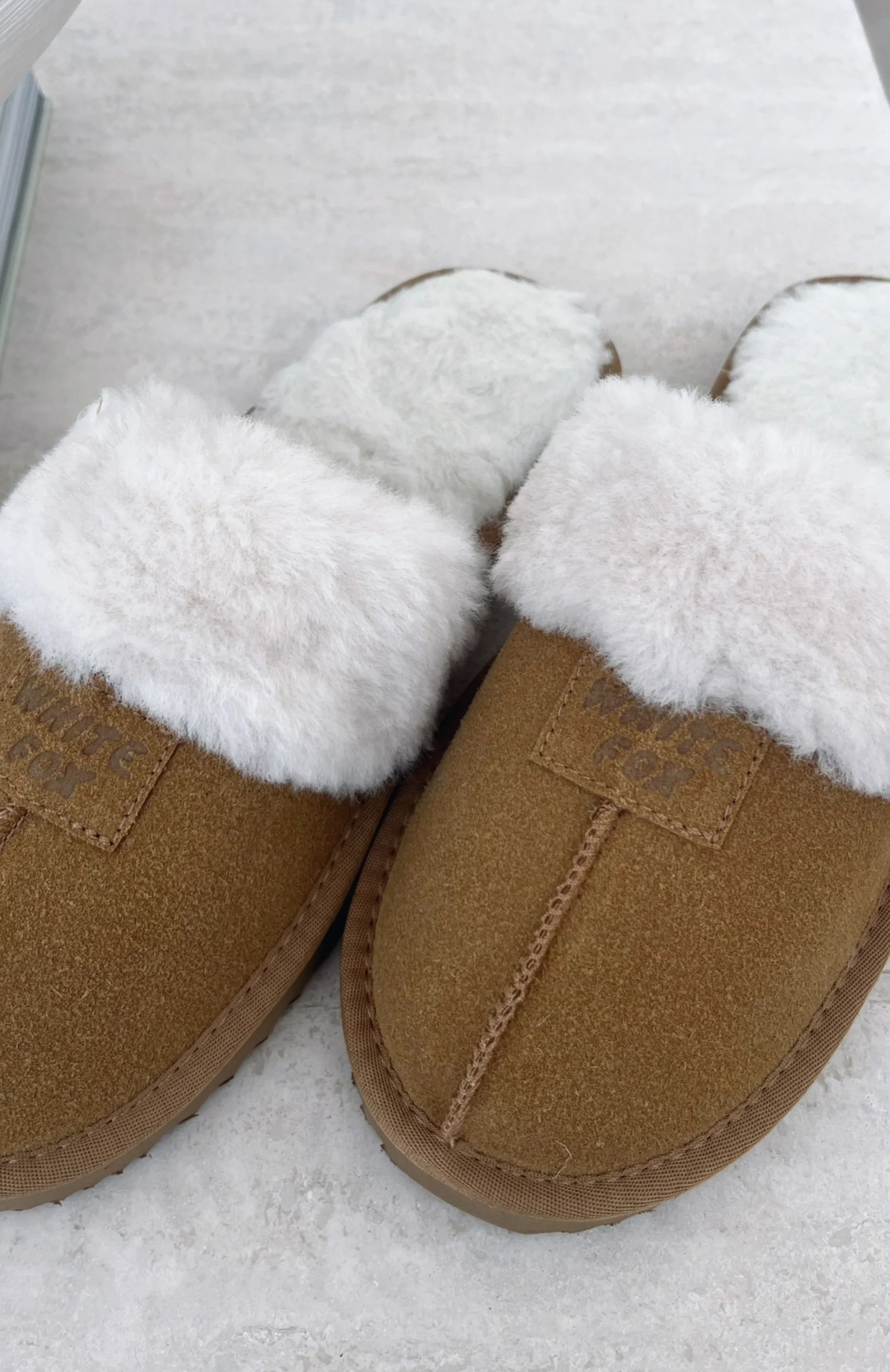 No words needed for the Grayson Slippers in Chestnut! These slippers feature a round, closed toe with a White Fox label at the front, a plush fur band across the top, an ultra-soft interior, a thick sole for everyday wear, and an open, round heel for comfort and ease. We loved these pair with a matching lounge set for the ultimate comfy look.