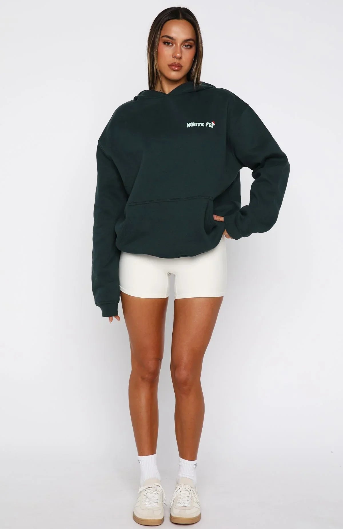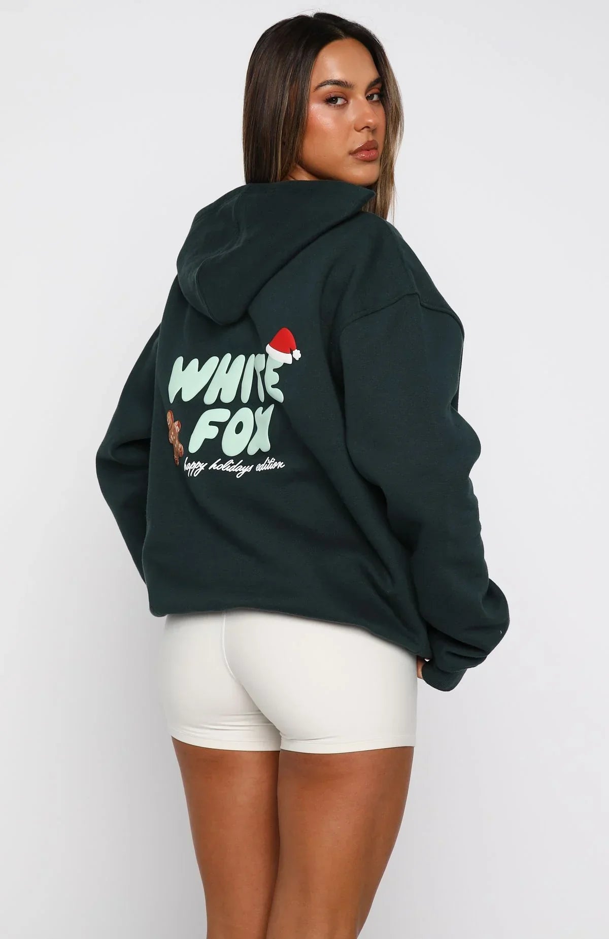 Santa called, he says you’re on the nice list. The Holly Jolly Christmas Oversized Hoodie in Pine is designed with a relaxed hood, slouched shoulders and ribbed hems, which round out an oversized silhouette. Featuring long sleeves, a roomy front pocket, and an unlined fleece interior, this hoodie delivers a cozy feel. White Fox puff‑print text embellishes the centre front and back, paired with "happy holidays edition" text. Style with lounge shorts, slippers, and give the gift of your presence this xmas.