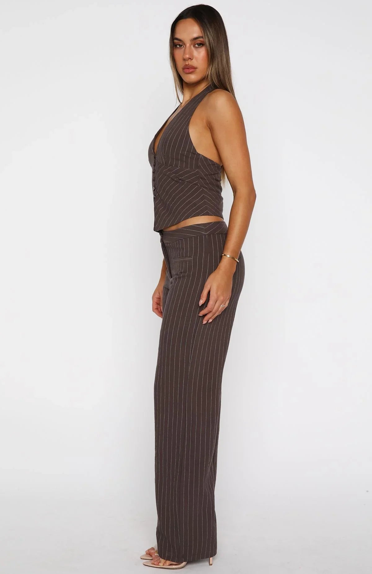 These pants are unmatched! The I Don't Compete Straight Leg Pants in Chocolate feature a thick waistband, hook and bar with zipper closure at the center front, two front faux pockets, and a wide-leg design. Pair them with the matching I Don't Compete Halter Top for a stunning long lunch fit with the gals!