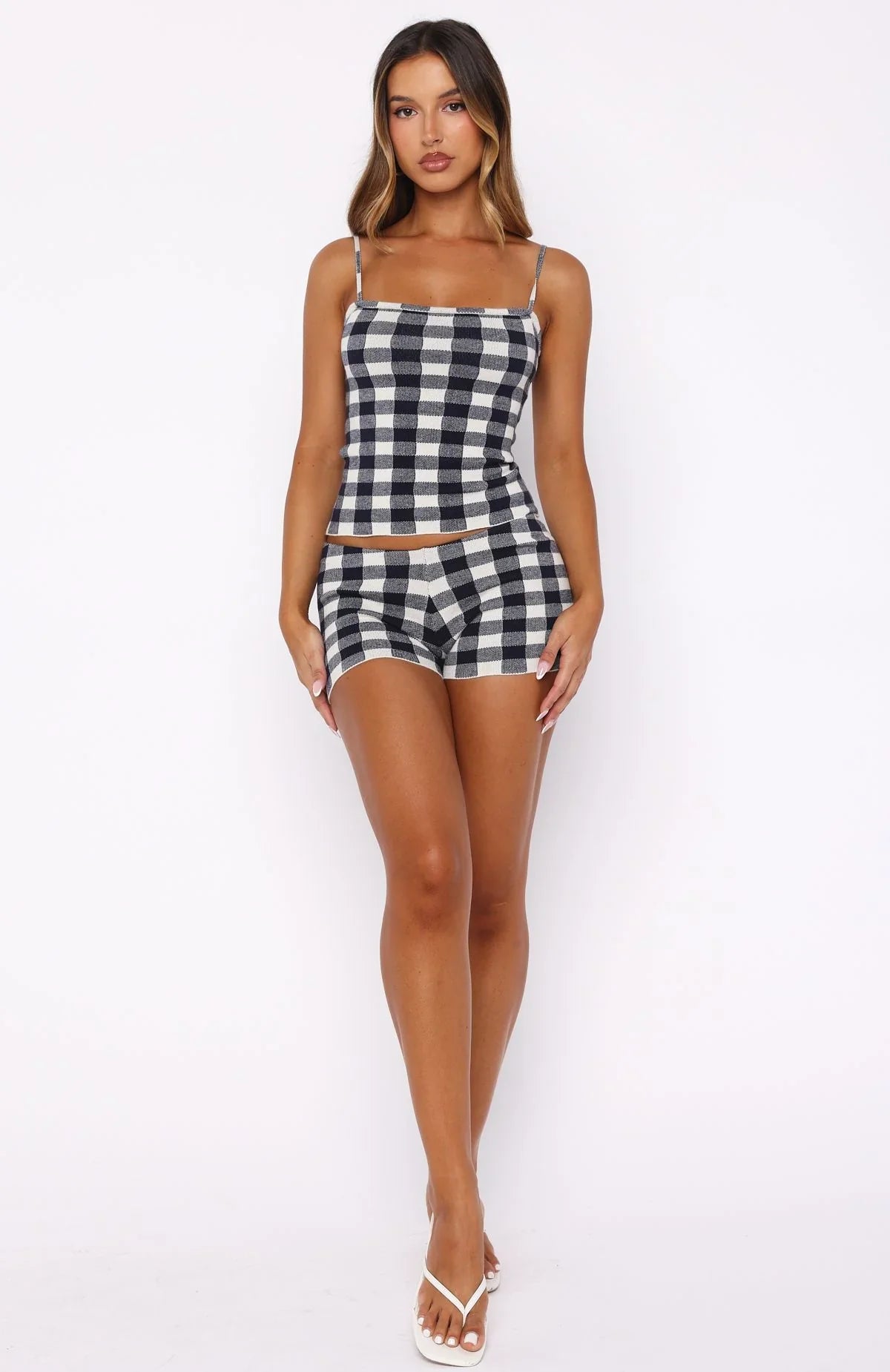Romanticize your life in the Iconic Duo Knit Cami Top in Navy/Cream Gingham! Features thin shoulder straps, a clean square neckline and a softly fitted bodice. Crafted from a soft, high‑stretch fabrication in gingham, it’s unlined for easy wear. Pair it with the matching Iconic Duo Knit Mini Shorts, a crochet head‑scarf and boots for a dreamy cottage‑core look.