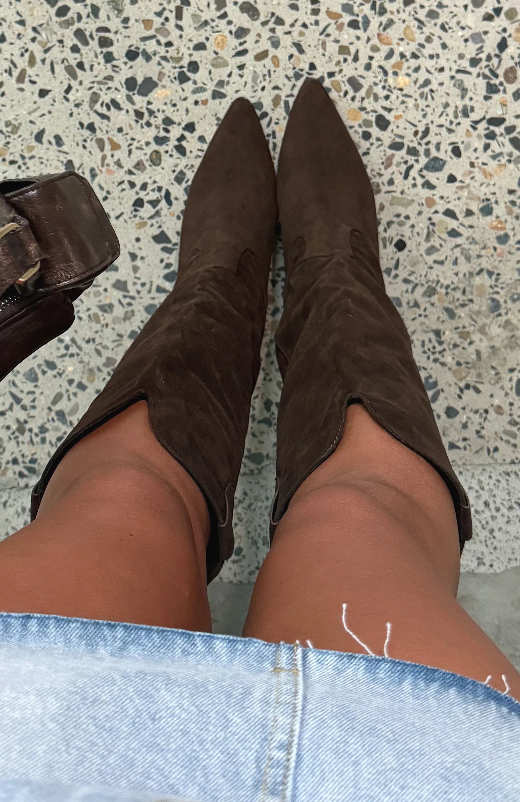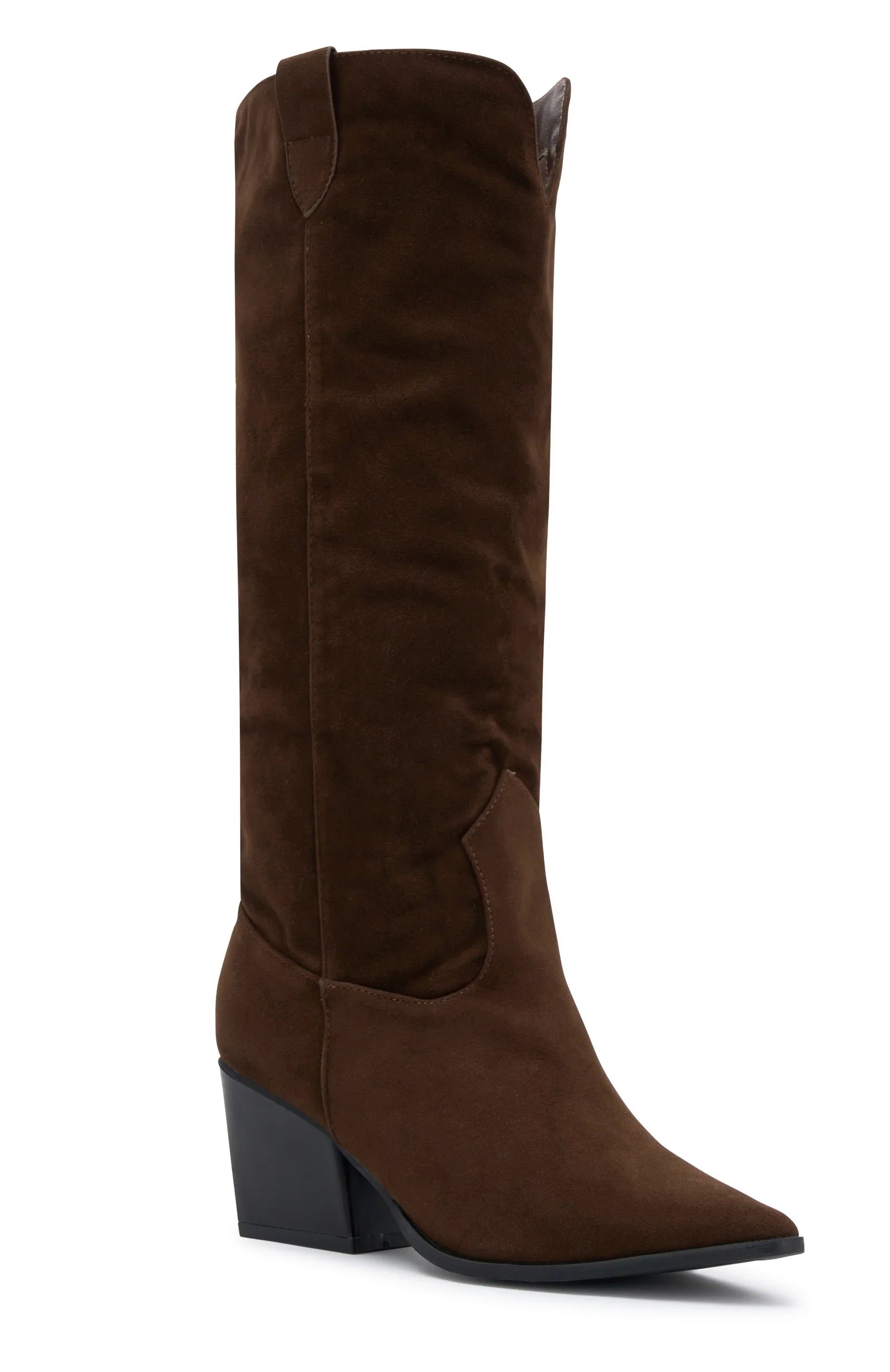 Cowboy boots, but make them chic! The In My Moment Knee High Boots in Chocolate Faux Suede features a block heel, pointed toe design, side pull tabs for easy slip on design and statement cut out design. Slide on with your next festival fit' for a look we are loving!