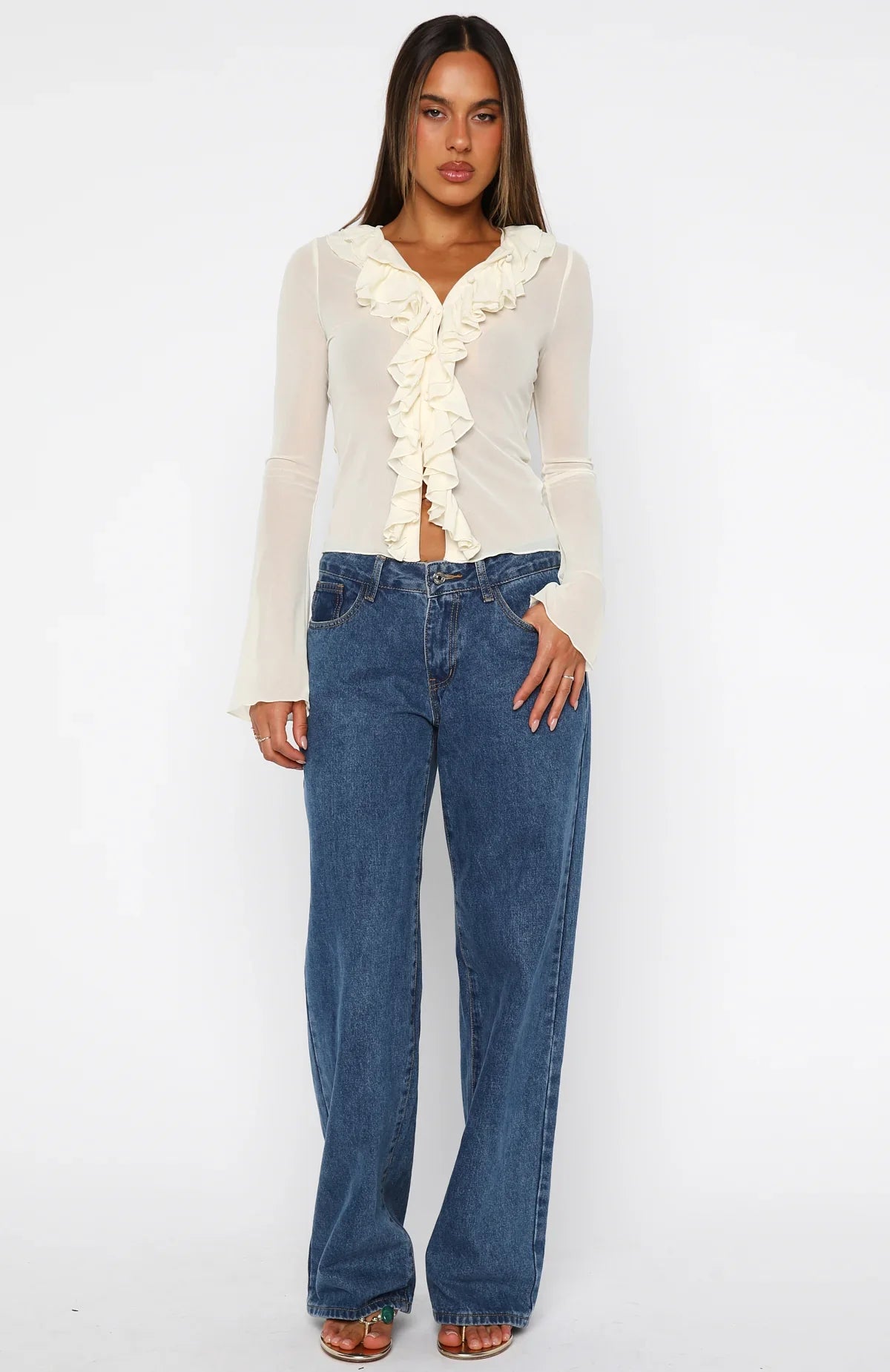 Turn heads effortlessly with the Just Me Long Sleeve Top in Butter. With a soft V‑neckline and cascading ruffle detail down the bodice, this top brings instant polish to your everyday wardrobe. Features flared long sleeves, semi‑sheer high‑stretch fabric and button‑down bodice. Pair it with your favourite jeans and simple sandals for a chic yet relaxed look.