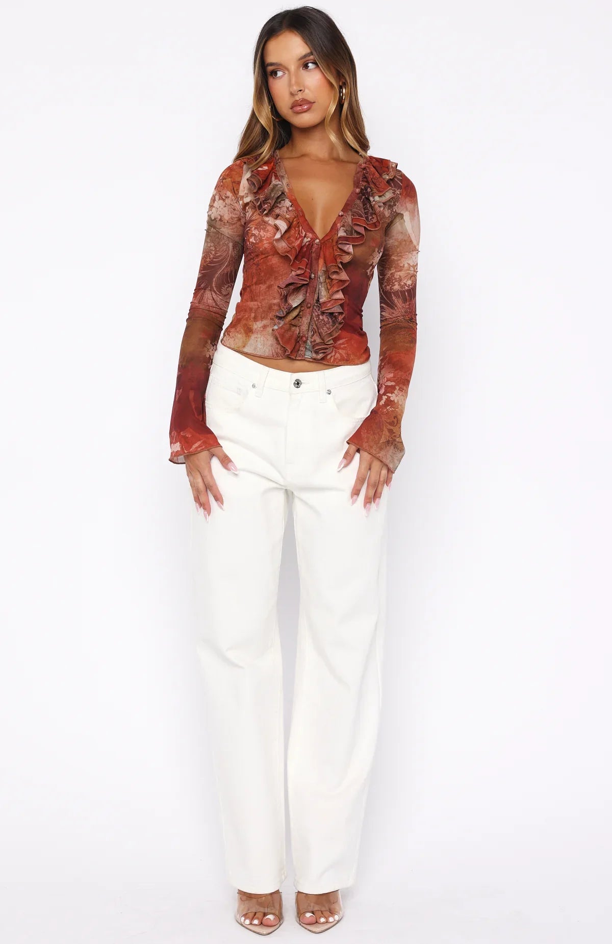 Turn heads effortlessly with the Just Me Long Sleeve Top in Garden. With a soft V‑neckline and cascading ruffle detail down the bodice, this top brings instant polish to your everyday wardrobe. Features flared long sleeves, semi‑sheer high‑stretch fabric and button‑down bodice. Pair it with your favourite jeans and simple sandals for a chic yet relaxed look.