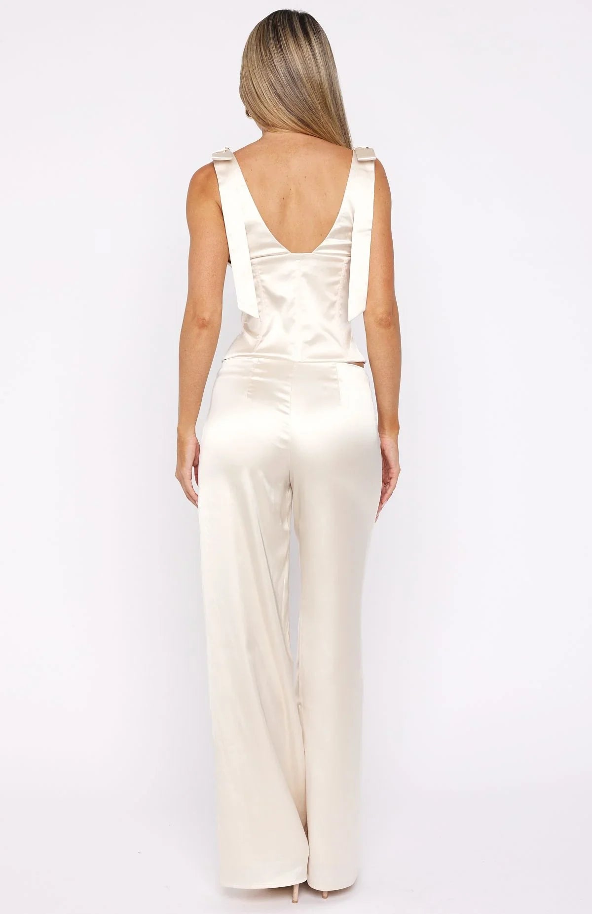 Holiday elegance in motion. The Keep It Lit Pants Pearl elevate your festive wardrobe with it's silky fabric, a fixed waistband for clean structure, and a refined hook‑and‑bar, zipper and button closure. Tailored front seams enhance the form, while the wide‑leg silhouette drapes beautifully and all fully lined. Style them with the matching Keep It Lit Top Pearl and statement heels for an effortlessly chic holiday look.