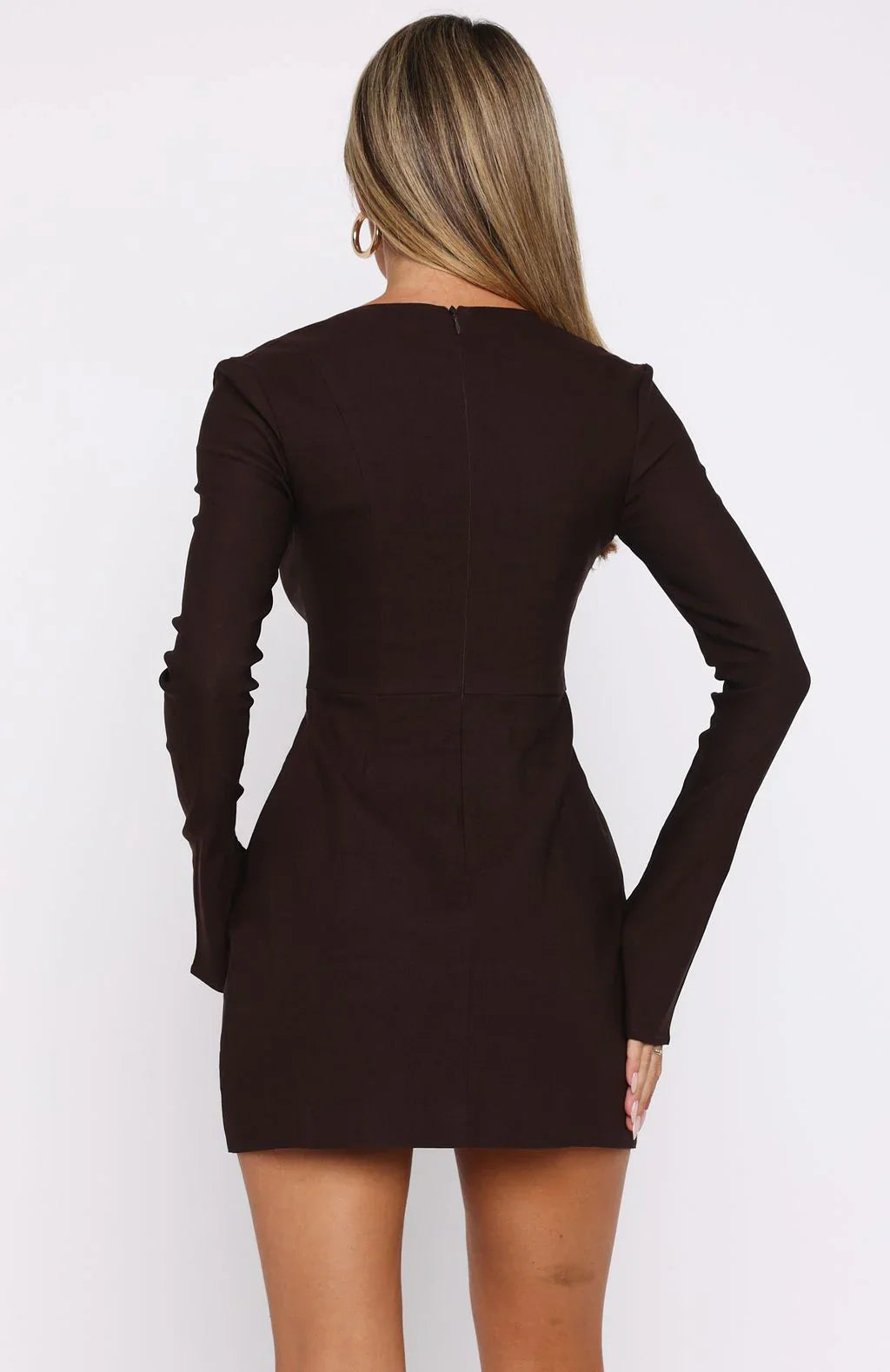 The Living For Love Long Sleeve Mini Dress in Chocolate combines timeless elegance with modern flair. Featuring a square neckline, flared long sleeves with split cuffs, and a fitted silhouette that flows into a flared skirt, this dress is both flattering and sophisticated. Designed with faux pockets and a fully lined interior, it ensures comfort and style. The back is finished with an invisible zipper and hook-and-eye closure for a seamless look. Pair it with kitten heels and simple gold jewelry to complete a chic ensemble.
