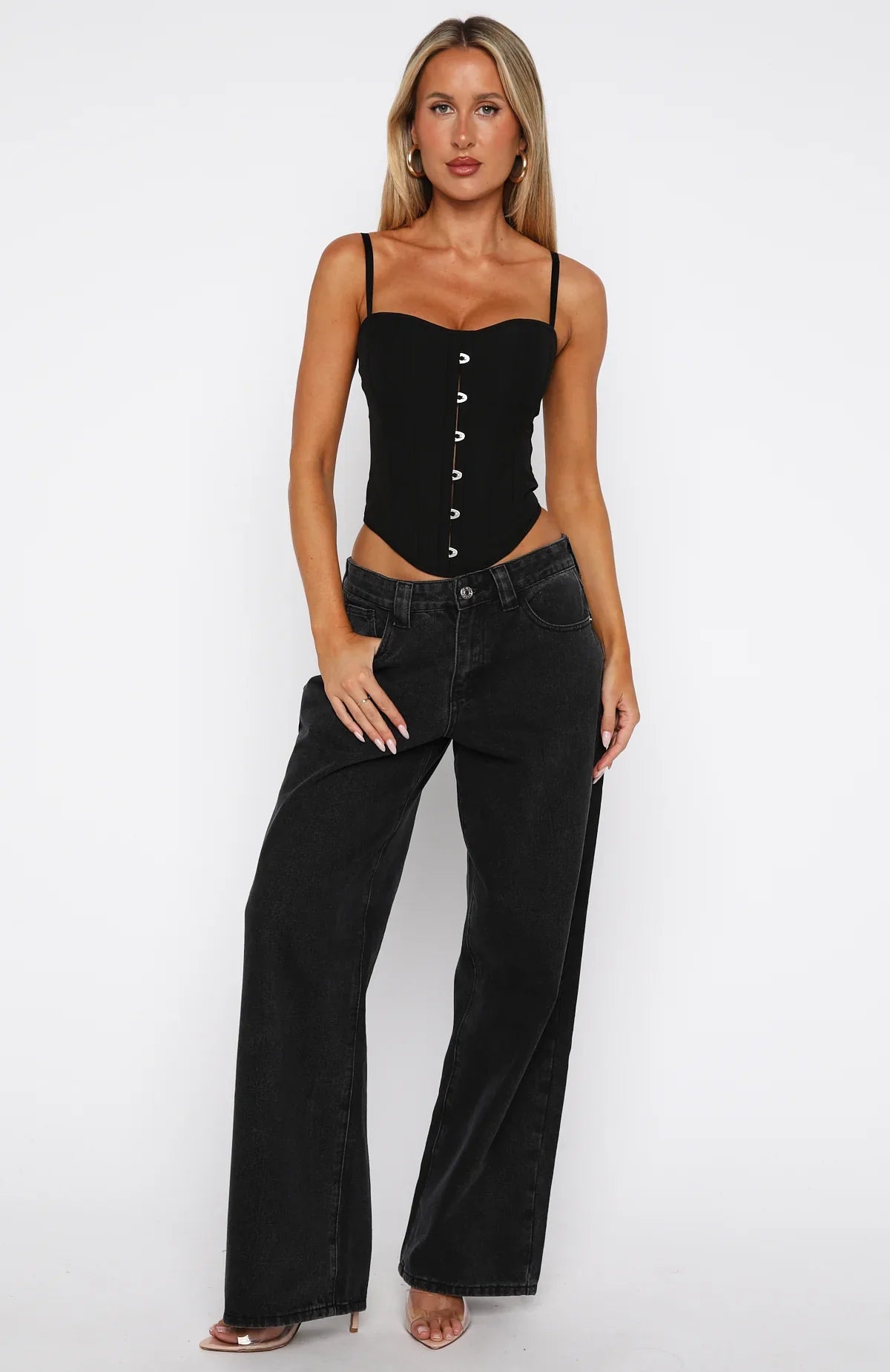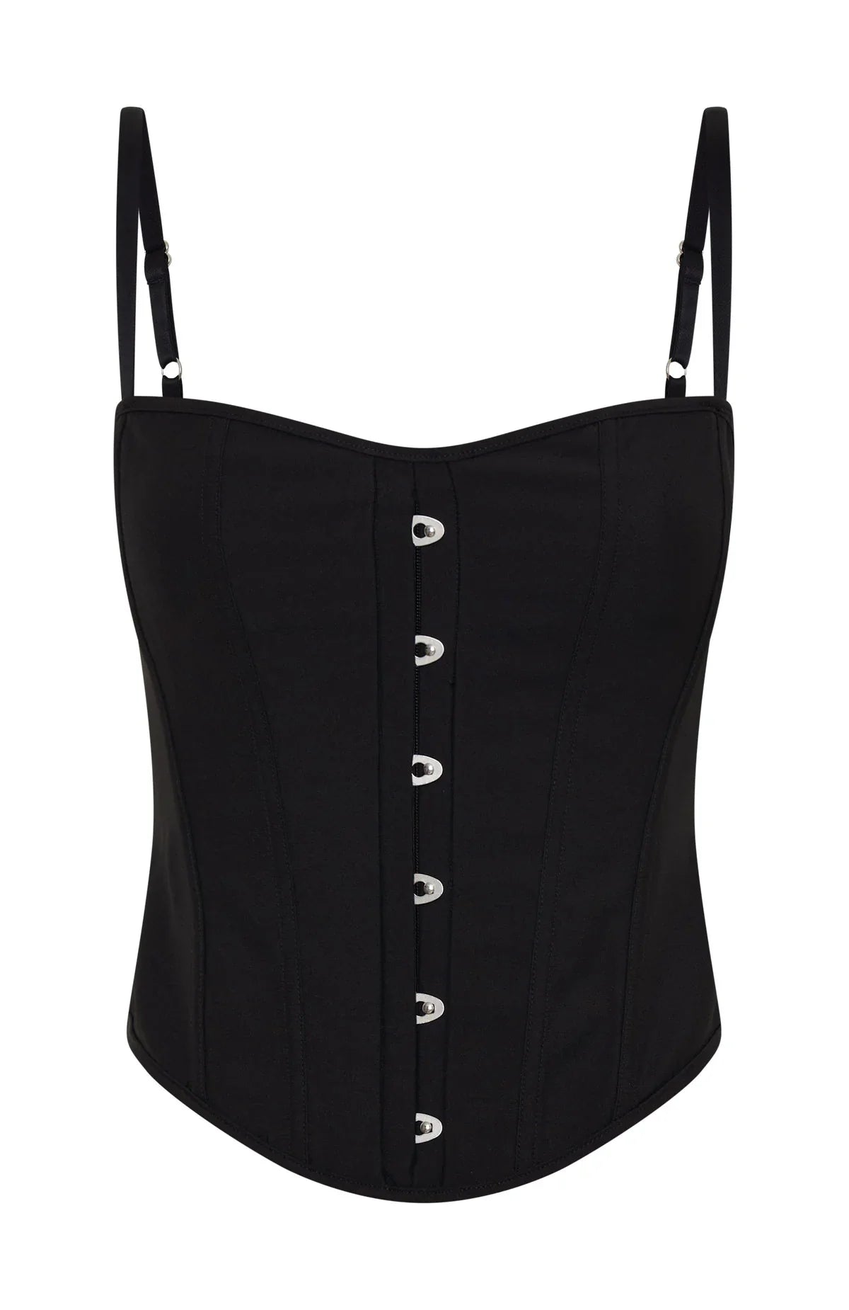 Today’s uniform! The Lost In Paris Bustier in black showcases thin elastic adjustable straps and a square neckline. Internal boning and a fixed hook‑and‑eye closure down the bodice ensure structure and support. Fully lined, with a back zipper finished by a hook‑and‑eye clasp, it’s tailored and effortlessly chic. Style with a mini skirt, stockings and statement heels for a chic look.